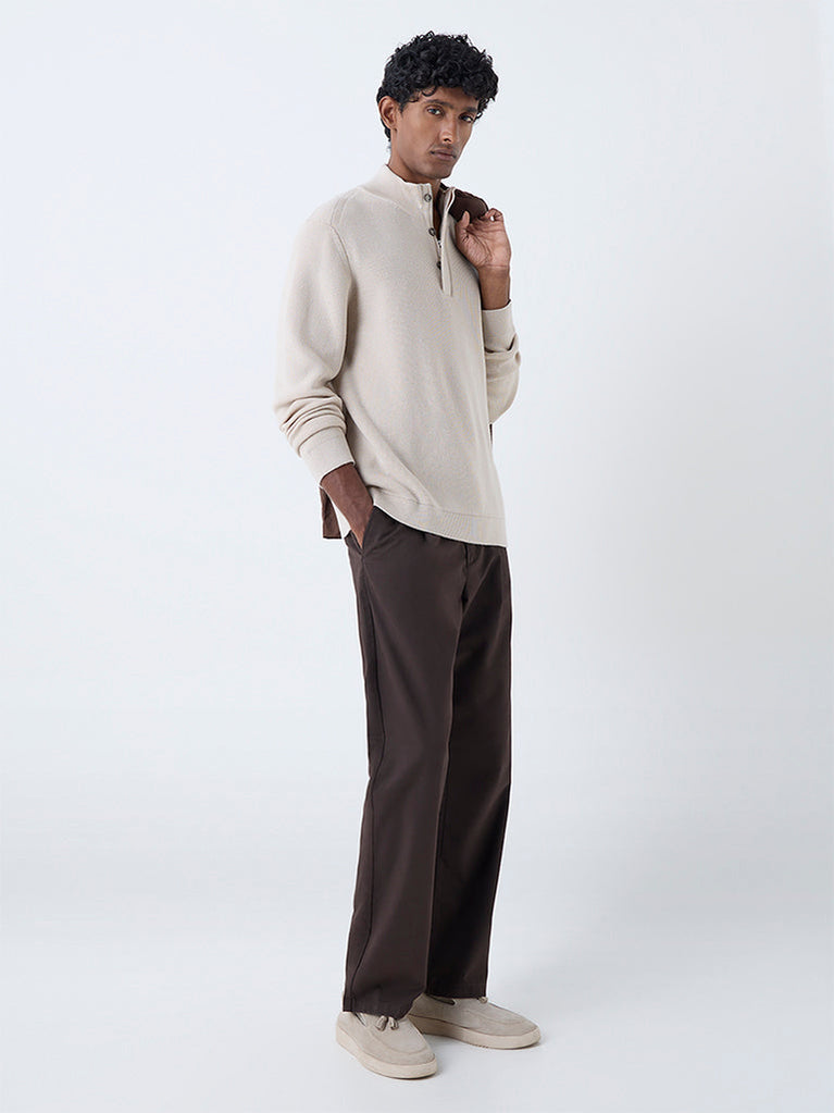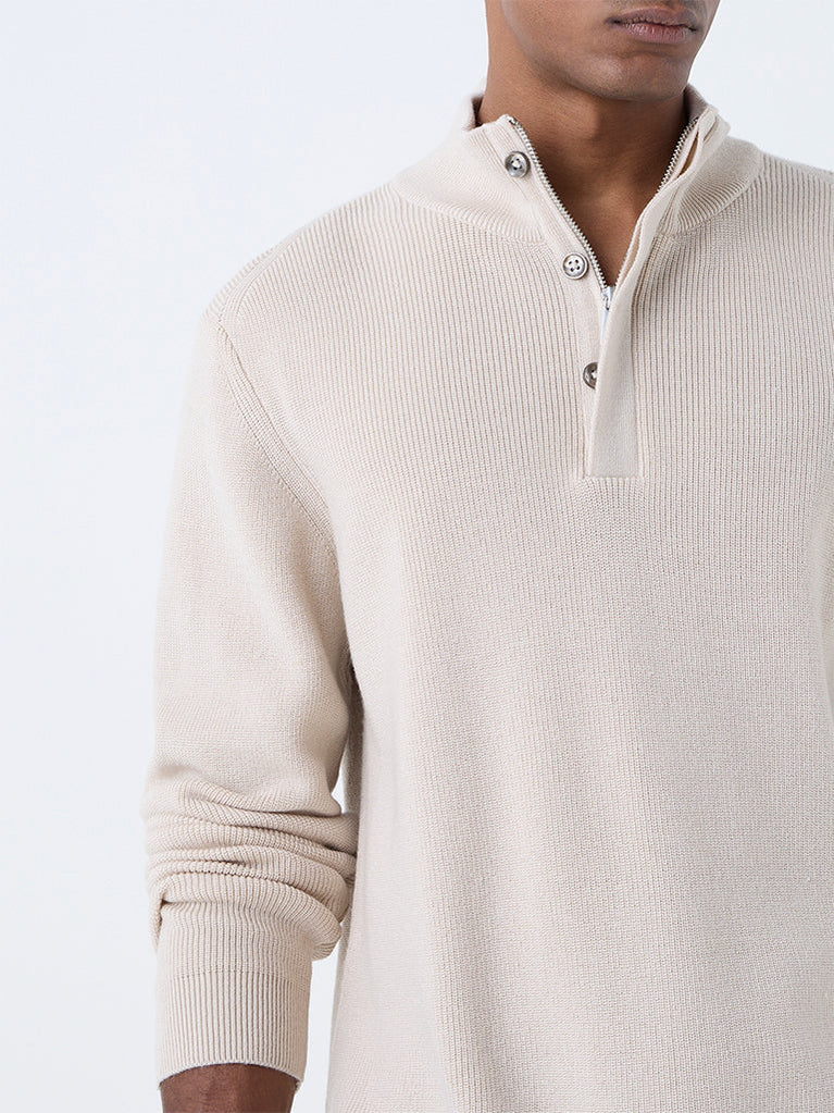 A study in understated sophistication, this beige sweater from Ascot is tailored in a relaxed fit for effortless layering. Detailed with a mock collar, full sleeves and a concealed zip topped with a button placket, it is woven from lightweight fabric to ensure ease and comfort while lending polish to everyday dressing.