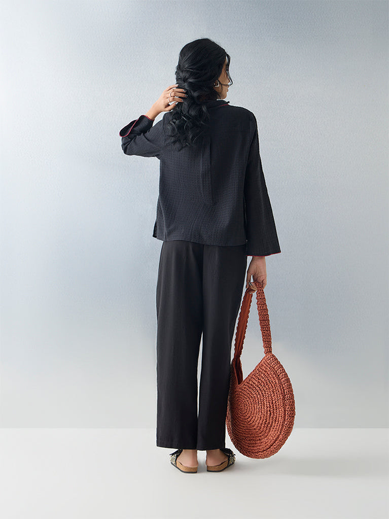 Bombay Paisley elevates everyday staples with this sheer black top. Scalloped edges at the V-neck and a buttoned front bring structure, contrasted by a tasselled knot tie at the back that channels playful ease. A versatile layer for Indo-Western styling.