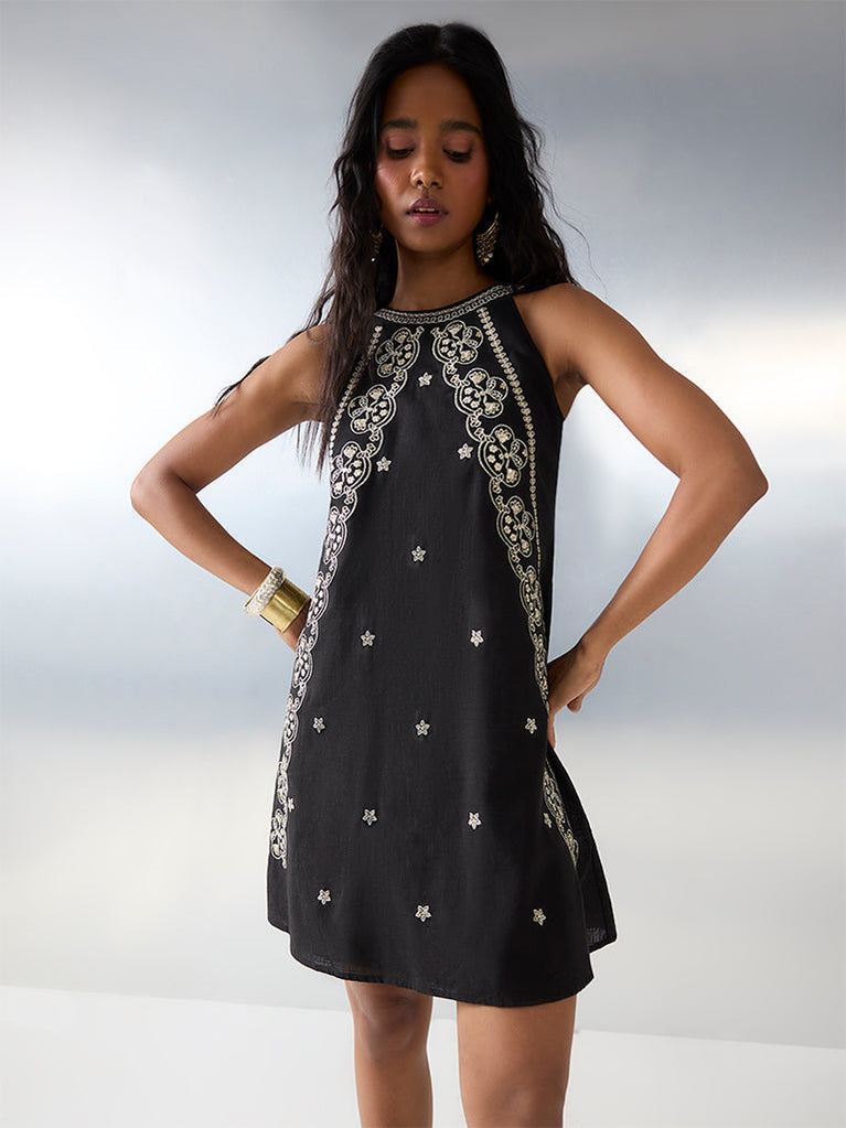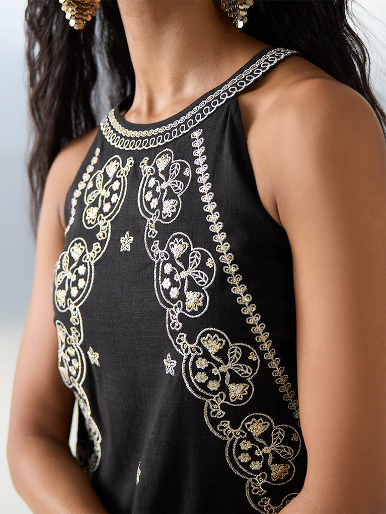 Bombay Paisley presents this black A-line dress styled with a round neck and a sleeveless cut for an easy silhouette. Featuring embellished embroidery on a breathable fabric build, it lends a subtle festive touch to everyday ethnic dressing.