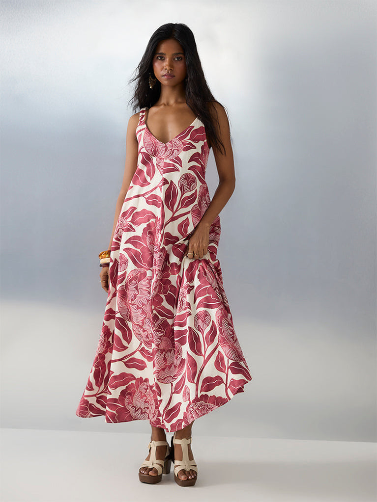 This red dress from Bombay Paisley features bold botanical prints for a striking appeal. It is styled with a V-neck, a sleeveless profile and functional side pockets. Woven from cotton-rich fabric, it’s a breezy pick for day brunches and casual get-togethers.