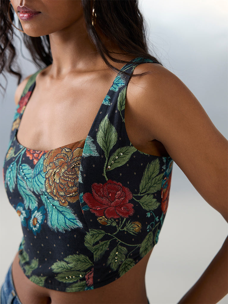 Bombay Paisley launches this black top, showcasing vivid floral prints. Woven from a sumptuous blend of cotton fabric, it is finished with a square-neck, a sleeveless profile and a smocked back for a flexible feel.