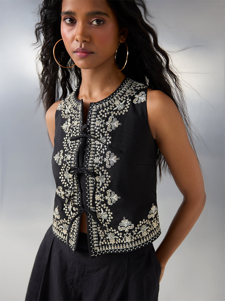 Bombay Paisley brings this black top woven from a cotton-blend fabric, promising day-long comfort. The front design features striking floral embroidery and tie-up details. Framed with a round neck and a sleeveless cut, it adds a refined edge to casual festive dressing.