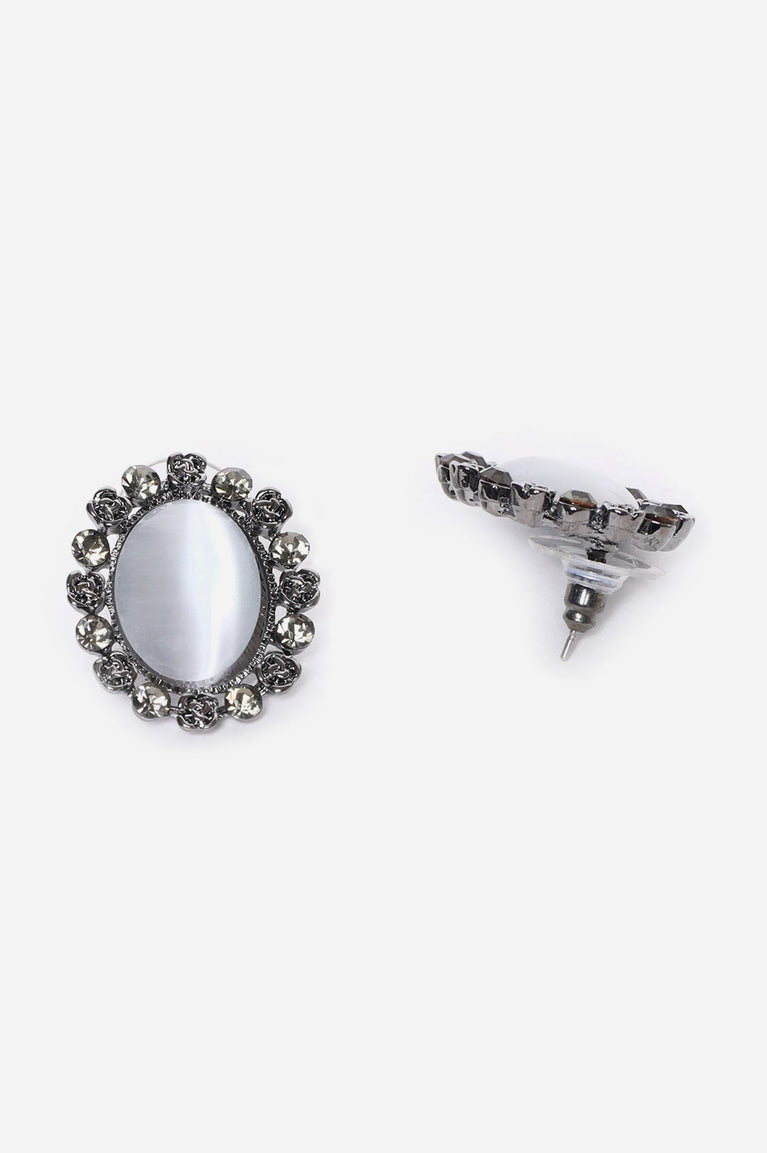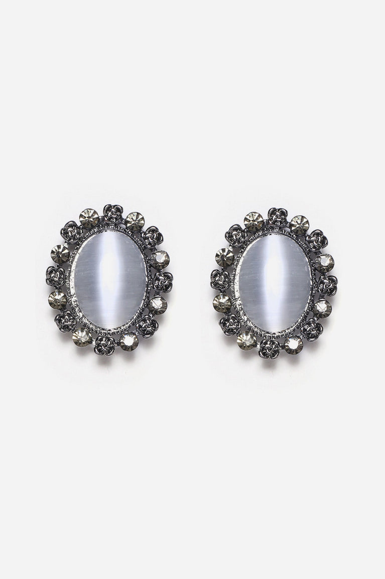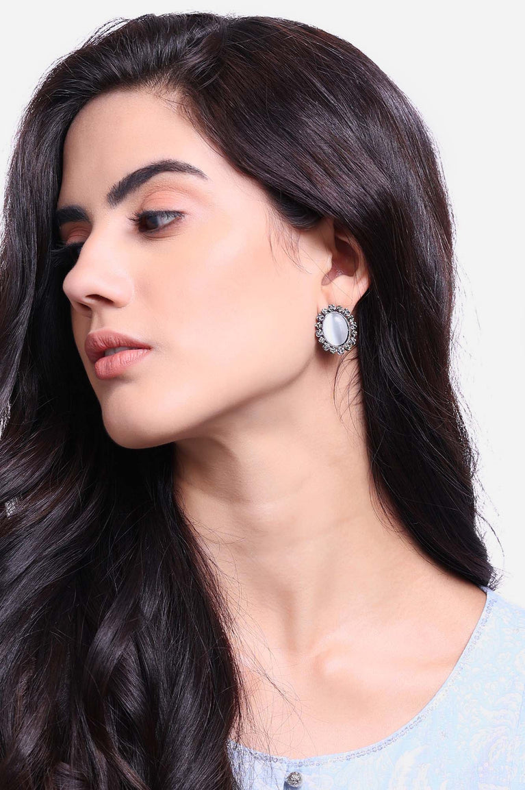 exquisite silver oxidised ethnic motif jhumki earrings studded with blue facted stones