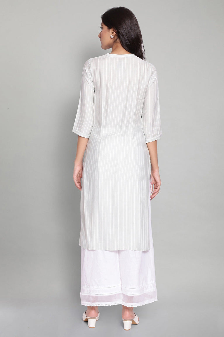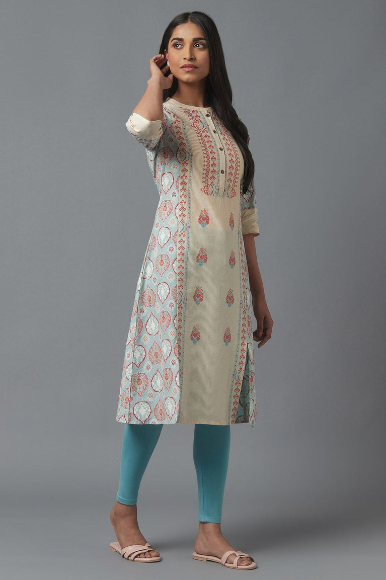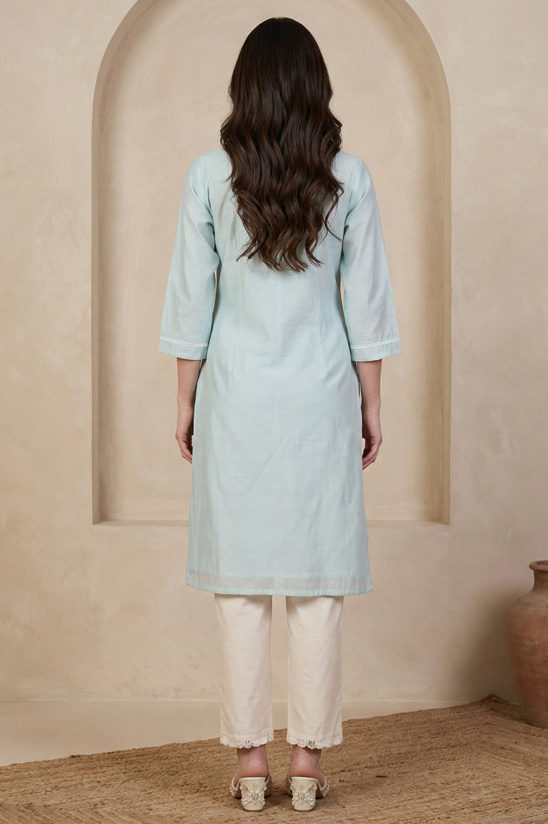 This light blue straight kurta for women by W is crafted from breathable viscose fabric, offering a fluid drape for all-day wear. Adorned with intricate white Chikankari-inspired embroidery and subtle sequin details on the yoke, it features a classic V-neckline and three-quarter sleeves. Ideal for office wear or casual outings, this ethnic staple pairs beautifully with white palazzo pants and traditional jhumkas for a polished, contemporary look.