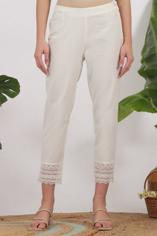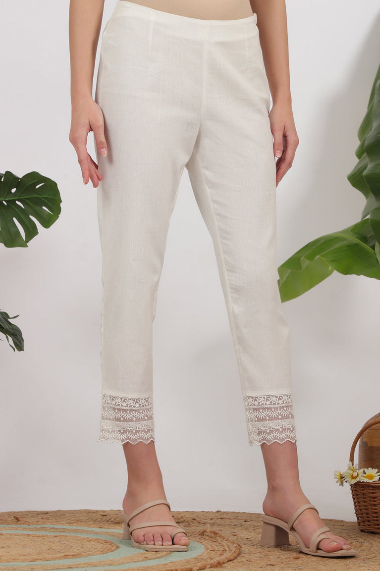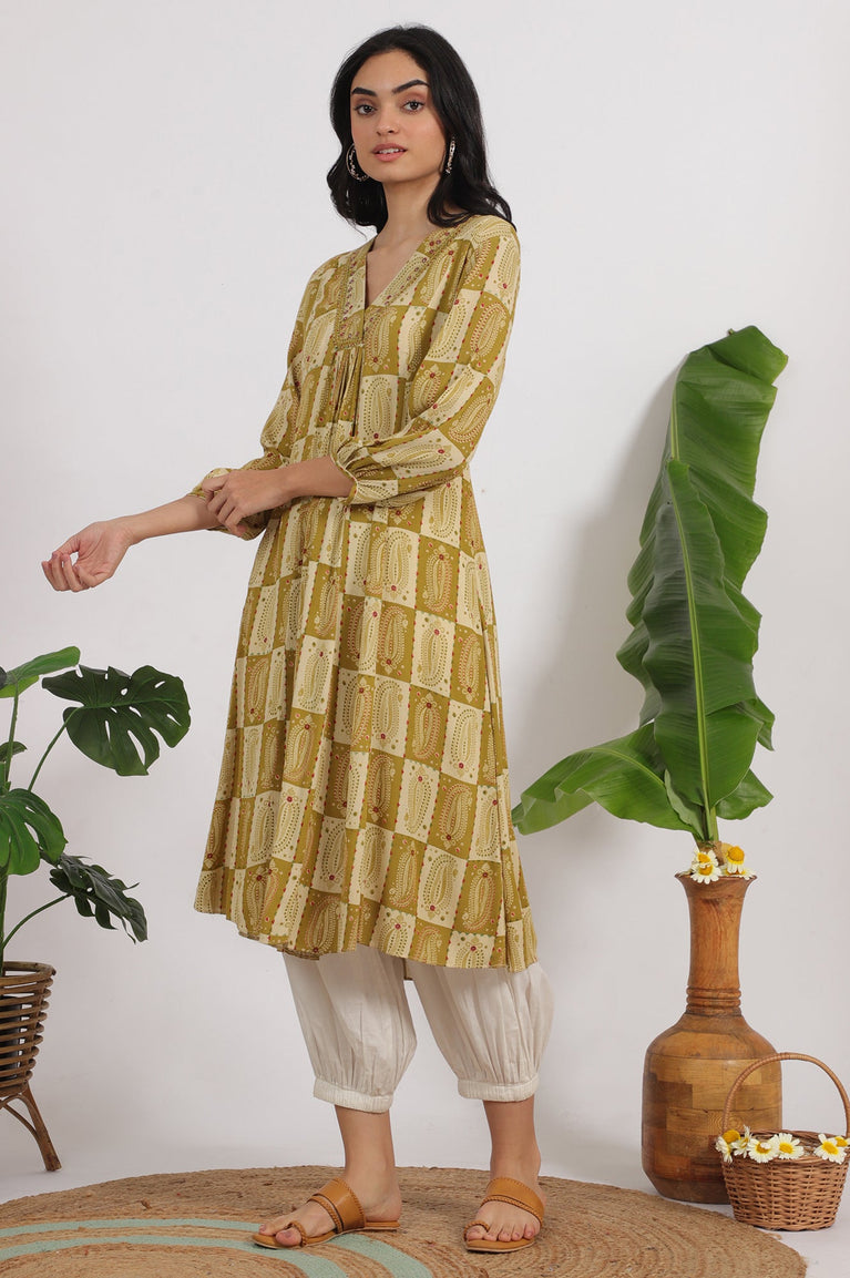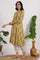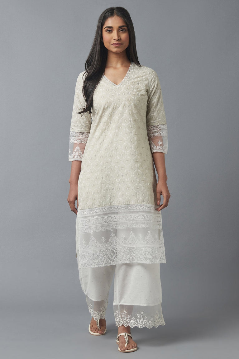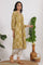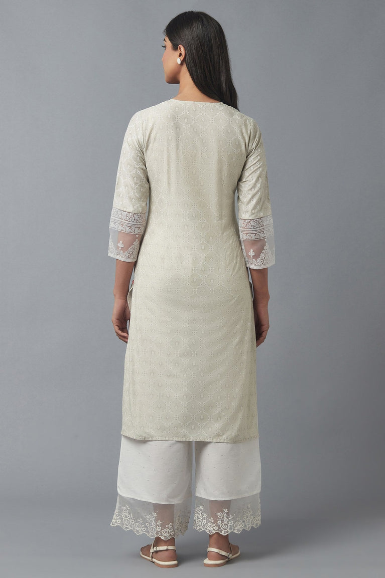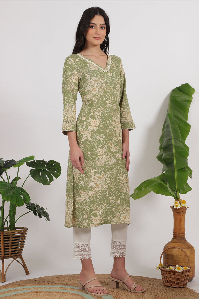 Green Print Mix Straight kurta Set. The Set Includes Green Straight kurta In Round Neckline. It Is Paired With White Lace Slim Pants.
