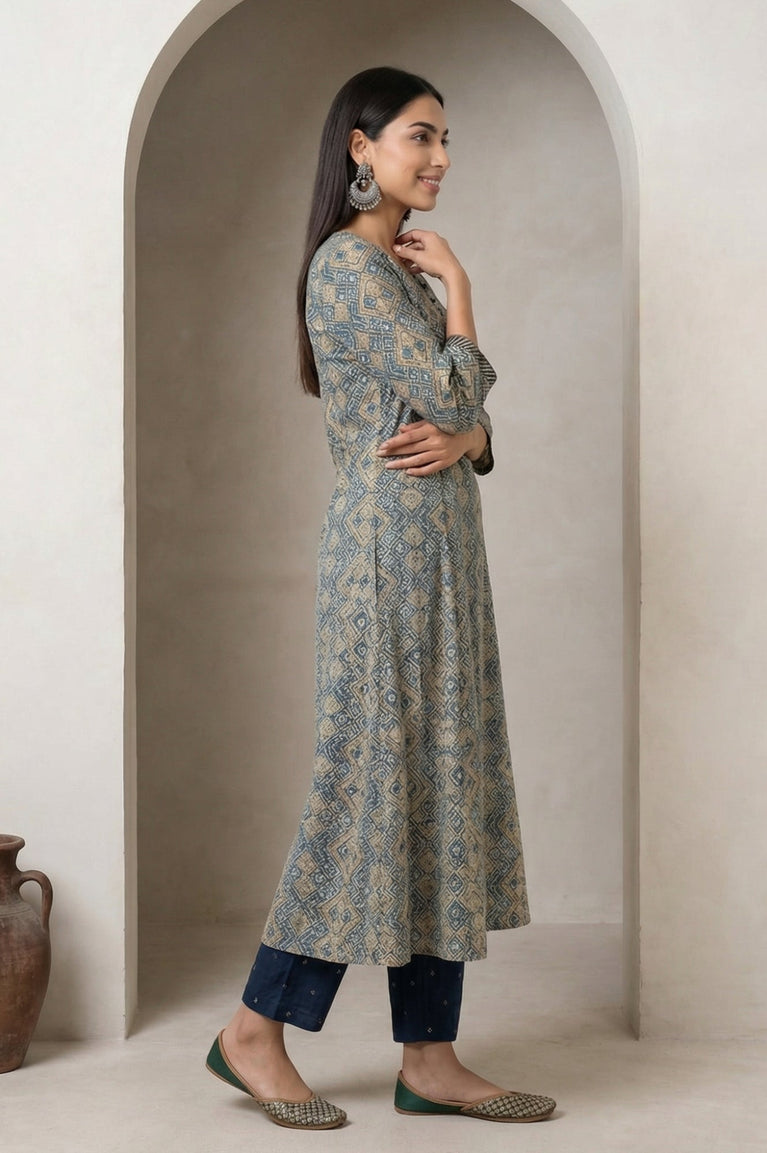 Folksong beige and blue modal satin printed kurta with mirror work brings a polished straight silhouette for smart casual days. The allover geometric diamond print, round neck and three-quarter sleeves keep it easy yet elevated, finished with side slits and a straight hem for fluid movement in Indian ethnic wear.