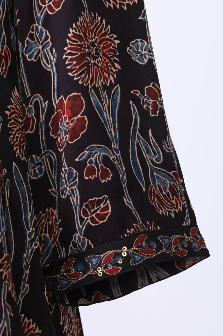 Crafted in rich brown satin with a striking all-over block print, this straight-fit kurta for women is a versatile addition to your smart casual wardrobe. The lightweight woven fabric flows beautifully, while delicate sequin ornamentation adds a hint of subtle shimmer to the V-neckline. Designed with side slits, three-quarter sleeves, and an opaque finish, it offers both comfort and effortless style for daily outings or informal gatherings. Pair this elegant ethnic wear for women with contrasting bottoms for a refined daytime look.