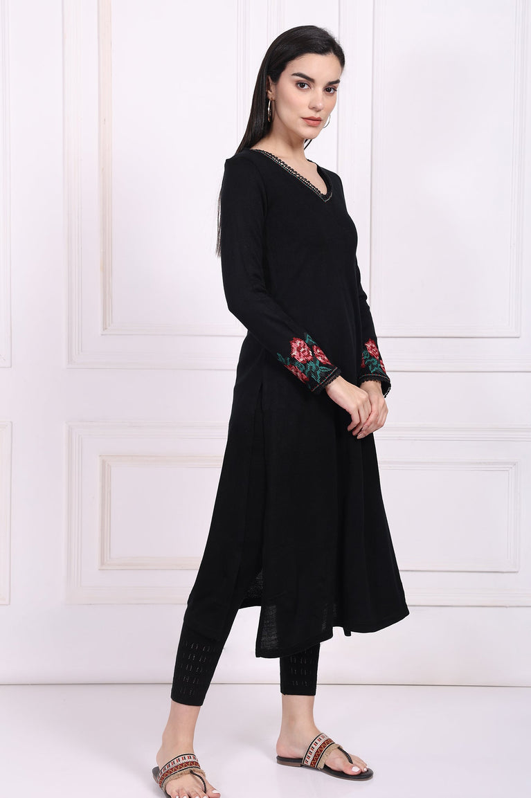 A winter wardrobe essential that speaks volumes in its subtlety. This A-line kurta for women is rendered in a deep Onyx Black, offering a canvas of quiet sophistication. Its true charm lies in the exquisite details that set it apart. A graceful V-neckline is delicately traced with fine lace, adding a touch of romance and intricate texture to the simple silhouette. The full-length sleeves become a focal point, culminating in a stunning burst of vibrant floral embroidery that provides a captivating contrast against the dark, solid fabric. A whisper of matching lace at the cuffs harmoniously echoes the neckline's design. This elegant apparel is crafted from a soft, warm fabric that drapes beautifully, falling to a modest calf length with a clean, straight hemline and functional side slits for ease of movement. The solid, unadorned body ensures all attention remains on the exquisite ornamentation. You'll find this opaque long sleeve winter kurti is a piece you reach for repeatedly for its perfect blend of cozy comfort and undeniably refined style.