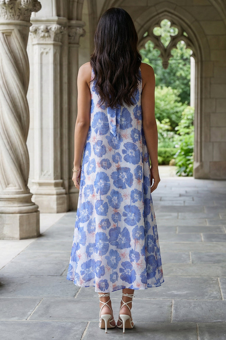 Blue Floral Printed Sleeveless Chiffon A-line Dress