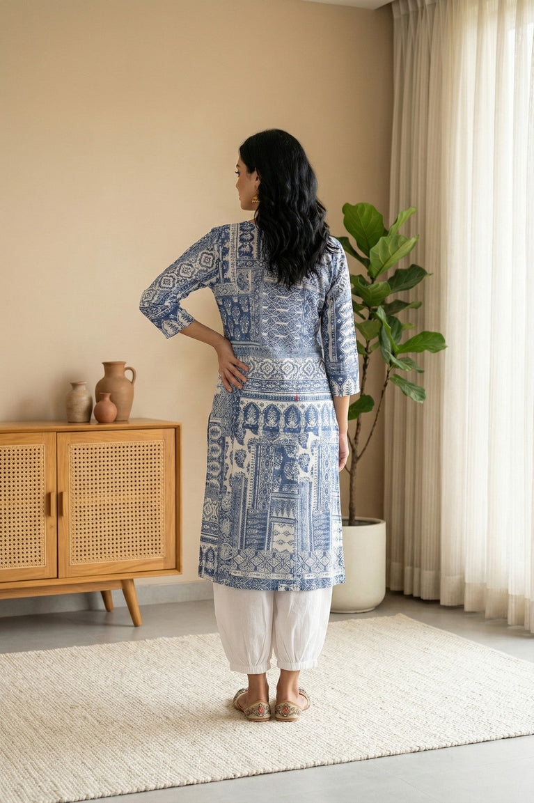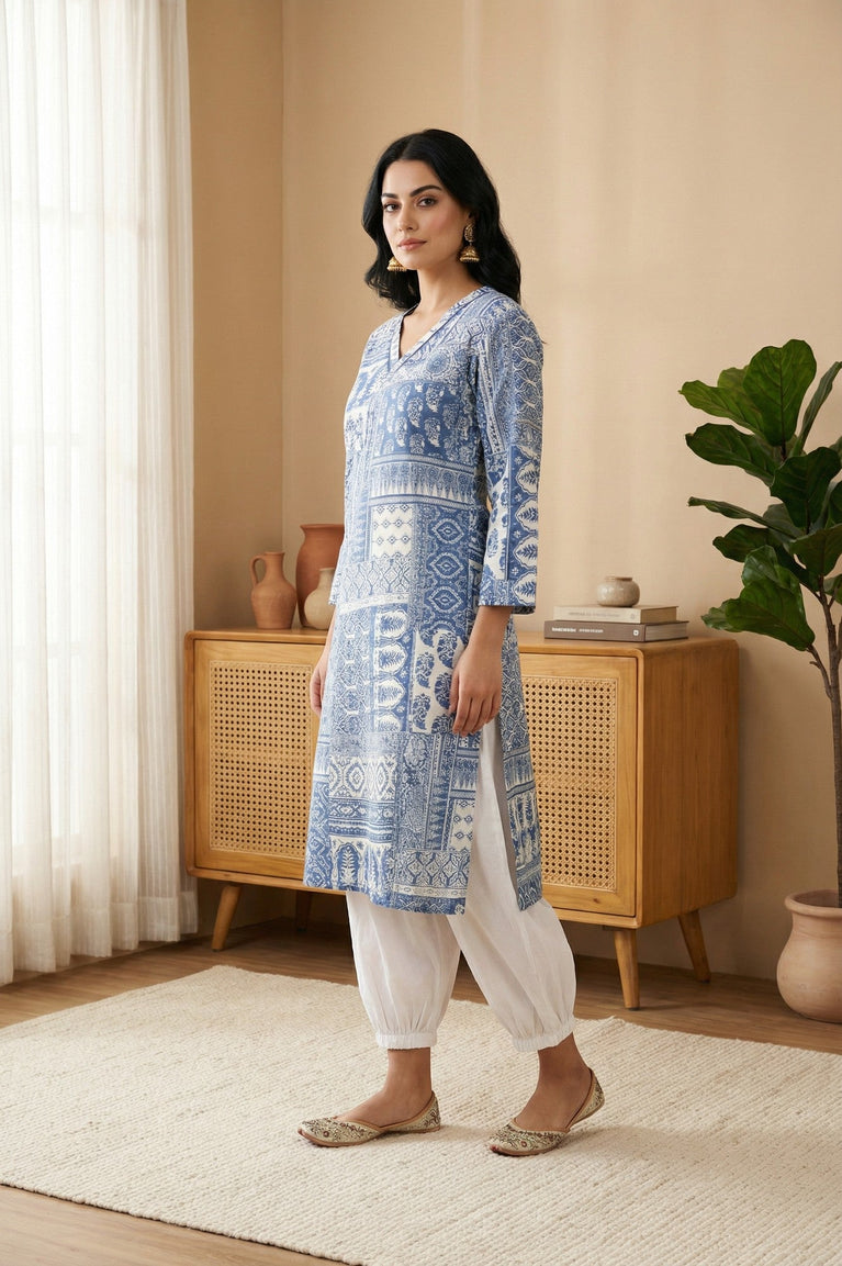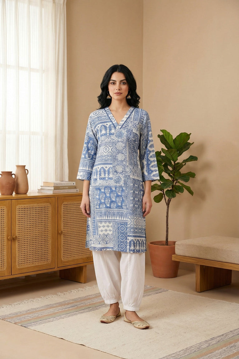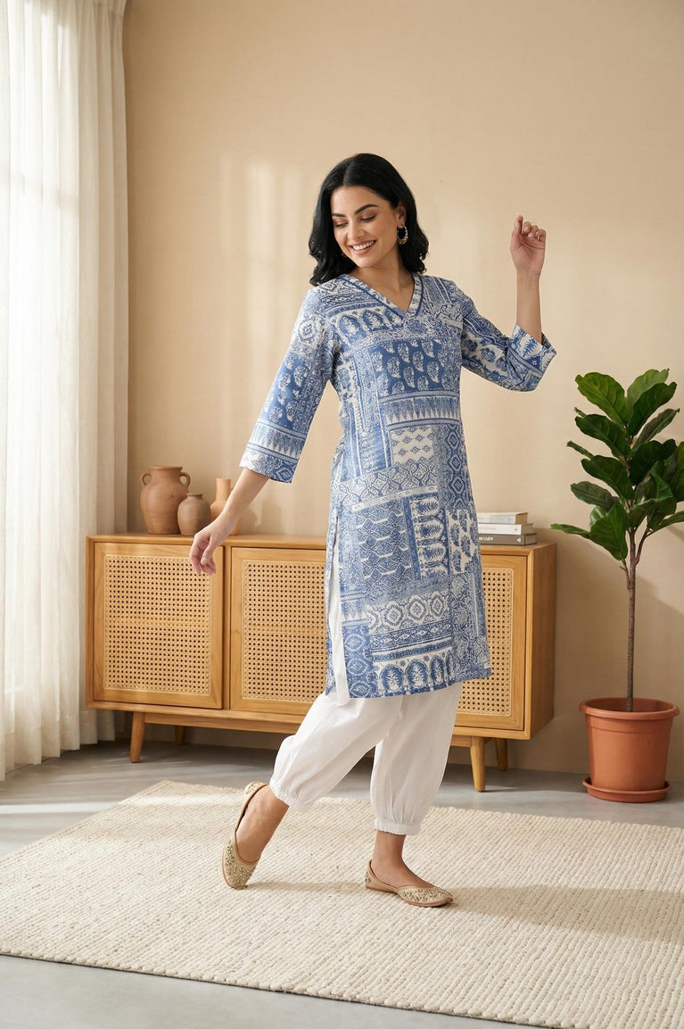 Crafted from a soft viscose blend, this blue straight kurta by W features a striking geometric ethnic patchwork print ideal for the modern wardrobe. Designed with a classic V-neck and comfortable three-quarter sleeves, it offers a sophisticated silhouette for office wear or casual outings. The lightweight woven fabric ensures all-day comfort, while the side slits add ease of movement. Pair this versatile Indian ethnic wear piece with white trousers and silver earrings for a polished daily look.