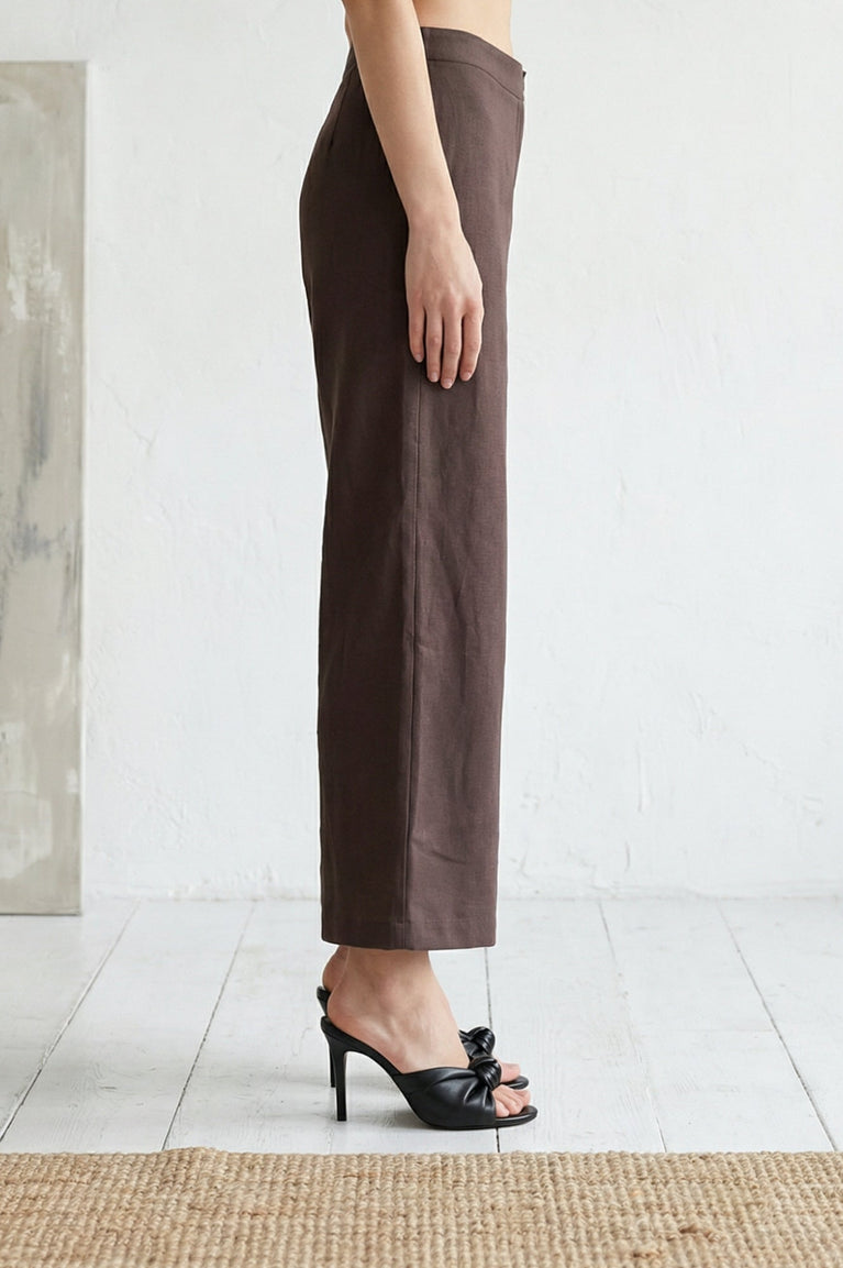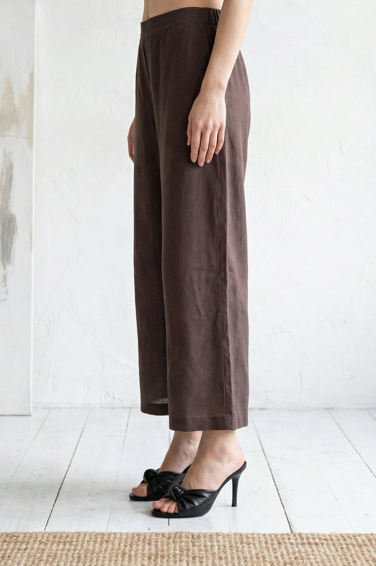 Tailored in a breathable flax blend, these brown wide-leg pants for women offer an effortlessly chic silhouette for both smart casual and relaxed outings. Designed with a high-rise, partially elasticated waist and a flat-front finish, this solid woven palazzo ensures all-day comfort while maintaining a refined look. Featuring an ankle-length cut, neat button details, and four practical pockets, it seamlessly transitions from office wear to casual street style. Pair this minimalist ethnic wear staple with your favorite tops or kurtas for a sophisticated summer ensemble.