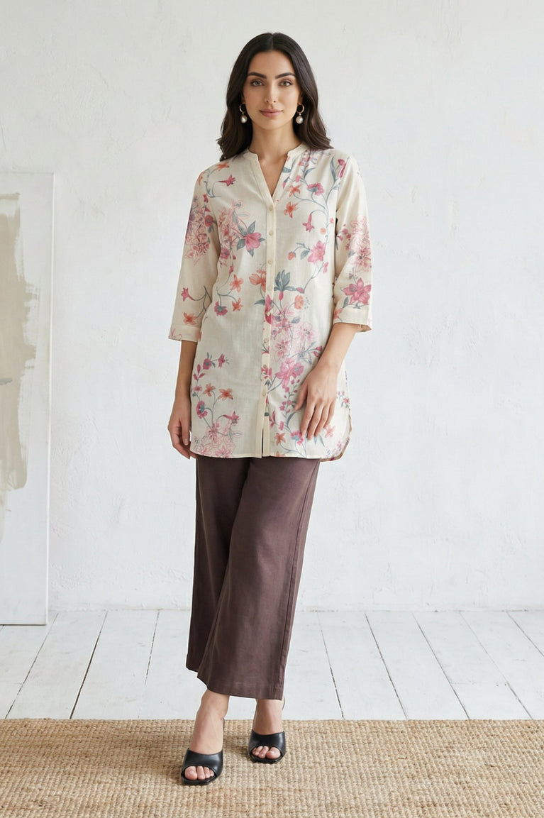 Step into effortless style with this beige floral printed tunic. The straight silhouette and V-neckline create a flattering look, while the long sleeves add a touch of elegance. Perfect for casual outings or office wear, this tunic is crafted from soft viscose fabric for all-day comfort. Pair it with black trousers or jeans for a chic winter ensemble.
