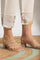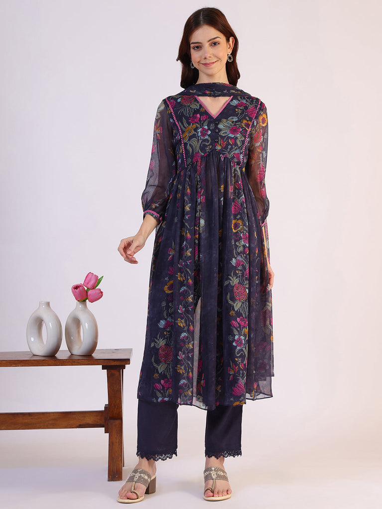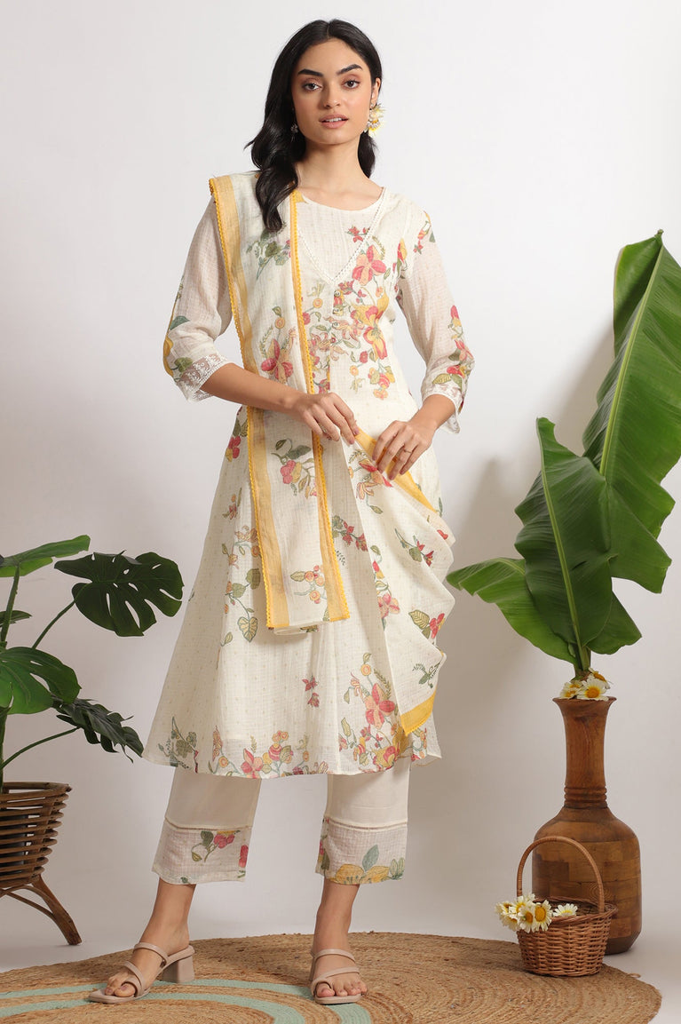 Light Beige Floral Printed Swiss Dot Net Spaghetti Flared Kurta, Pants and Dupatta Set