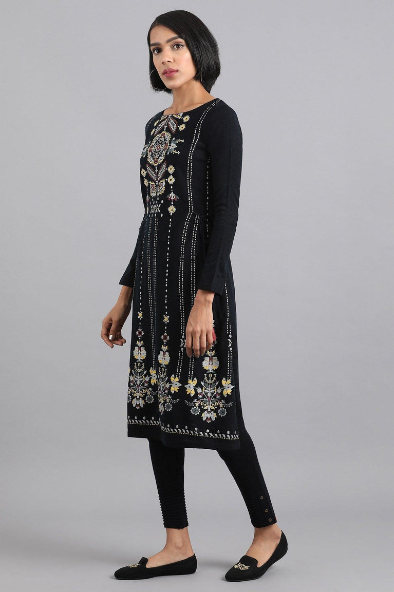 Navy Blue Textured Straight Kurta With Thread Embroidered Yoke