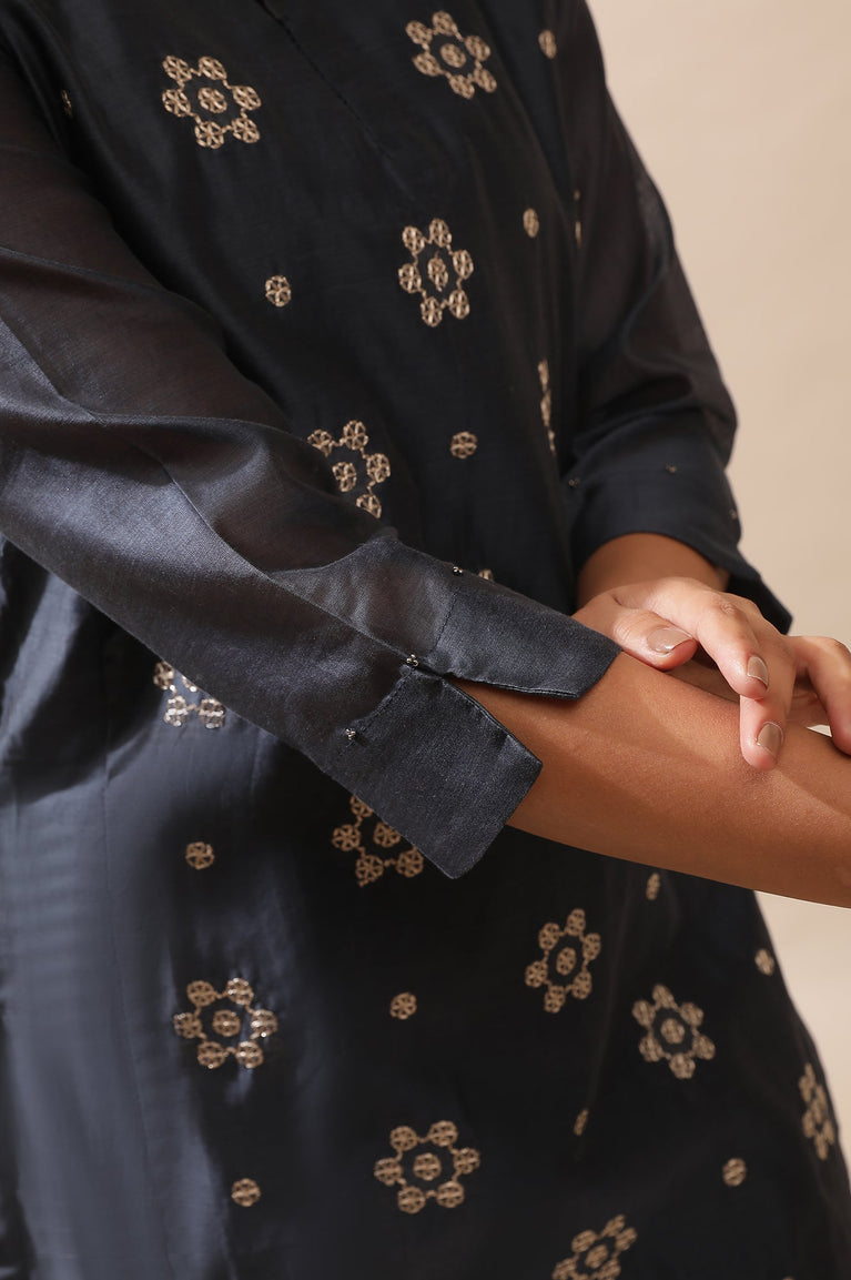 A Straight Kurta In Cotton Silk Features Geometric Zari Embroidery On The Front Panel And Lined With Soft Voile. Sleeves Are Accentuated With Stripes In The Facing And Bead Detail.