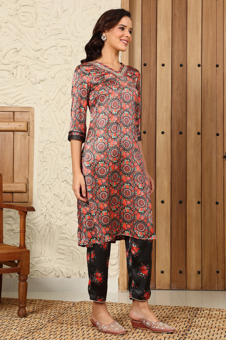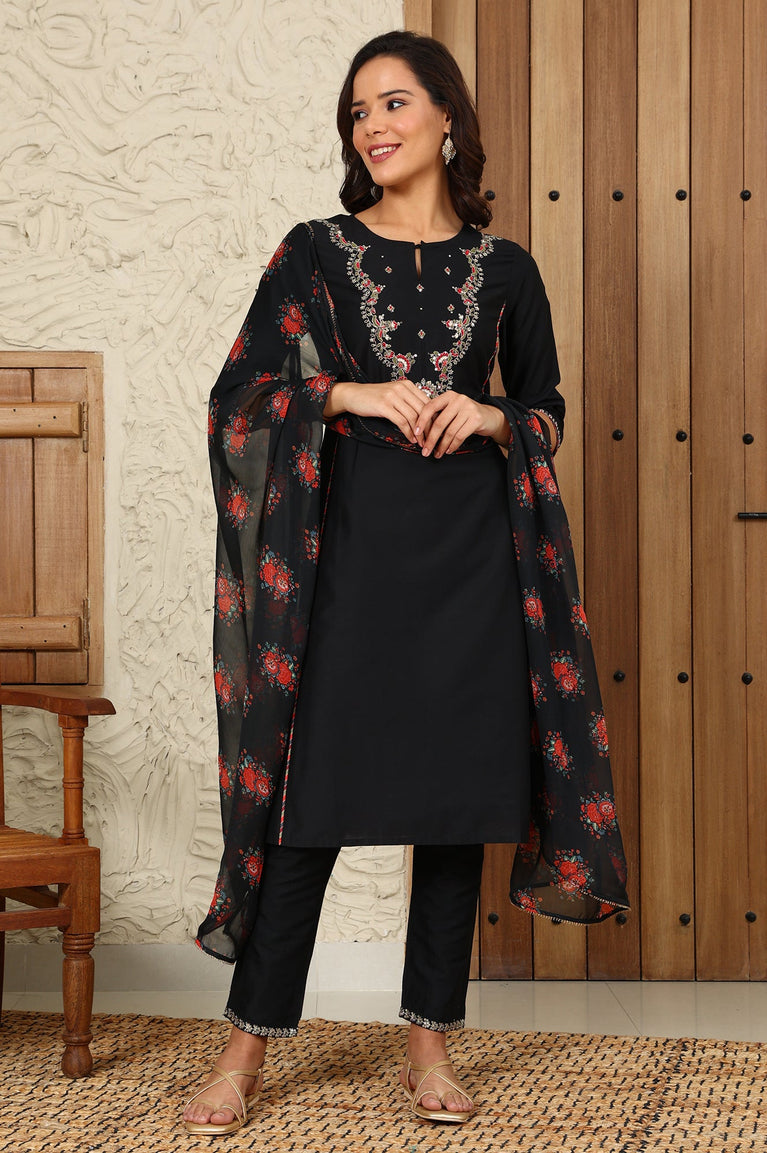 Black Floral Printed Japenese Satin Embroidered A-Line Kurta And Pants Set With Dupatta