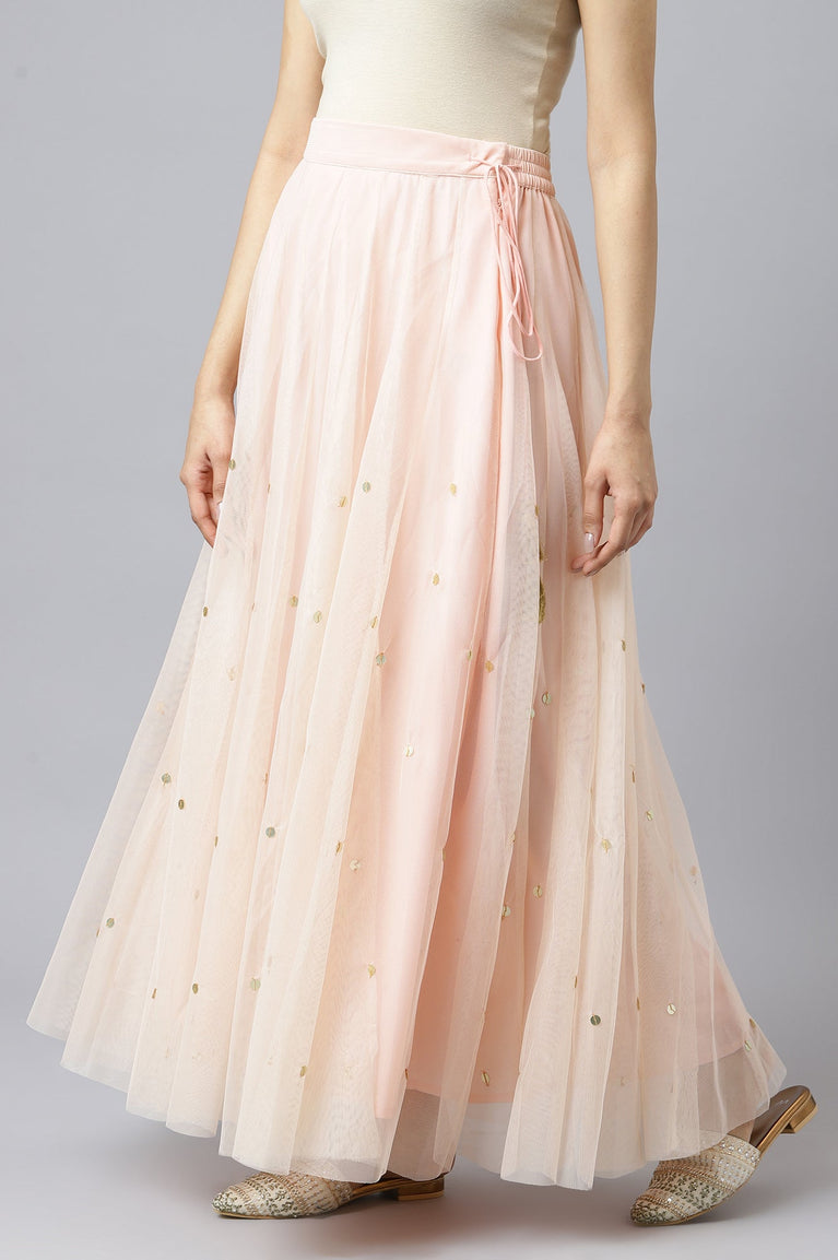 Designed In Flared Silhouette And Embellished With Sequins, This Maharani Mesh Skirt Is A Great Pick For Festive Season. It Has Attached Lining, And Drawstring Closure With Zip.