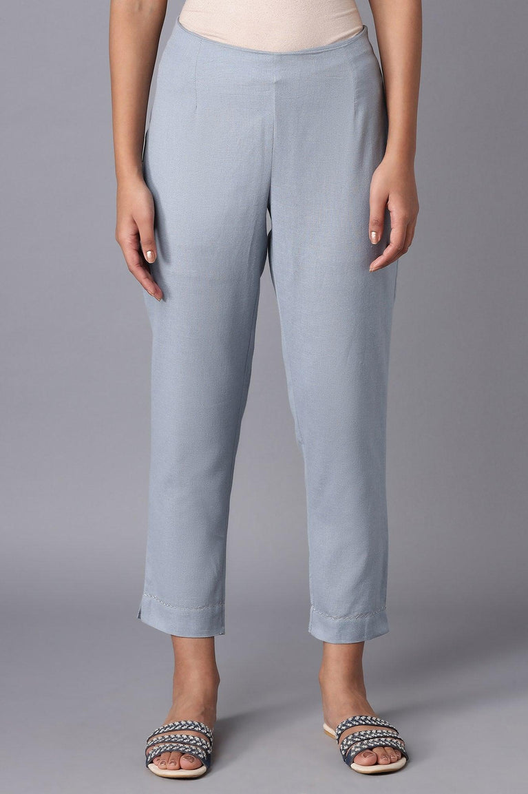 Looking for a perfect pair of bottom to add in your light festive looks? Then this pair of blue chambray slim pants are here to elevate your look. This solid straight silhouette pants in mid-rise waist has metallic embroidery and side zip with button closure.