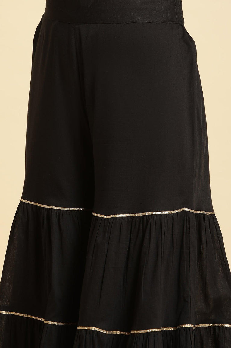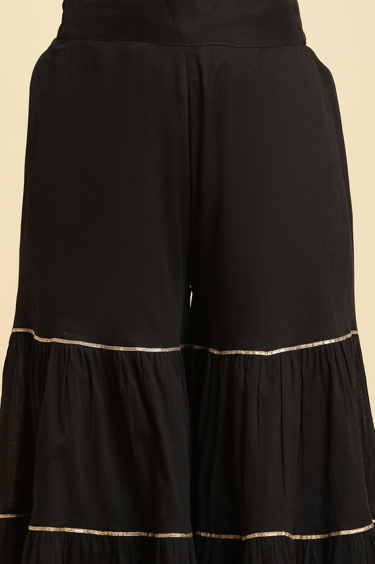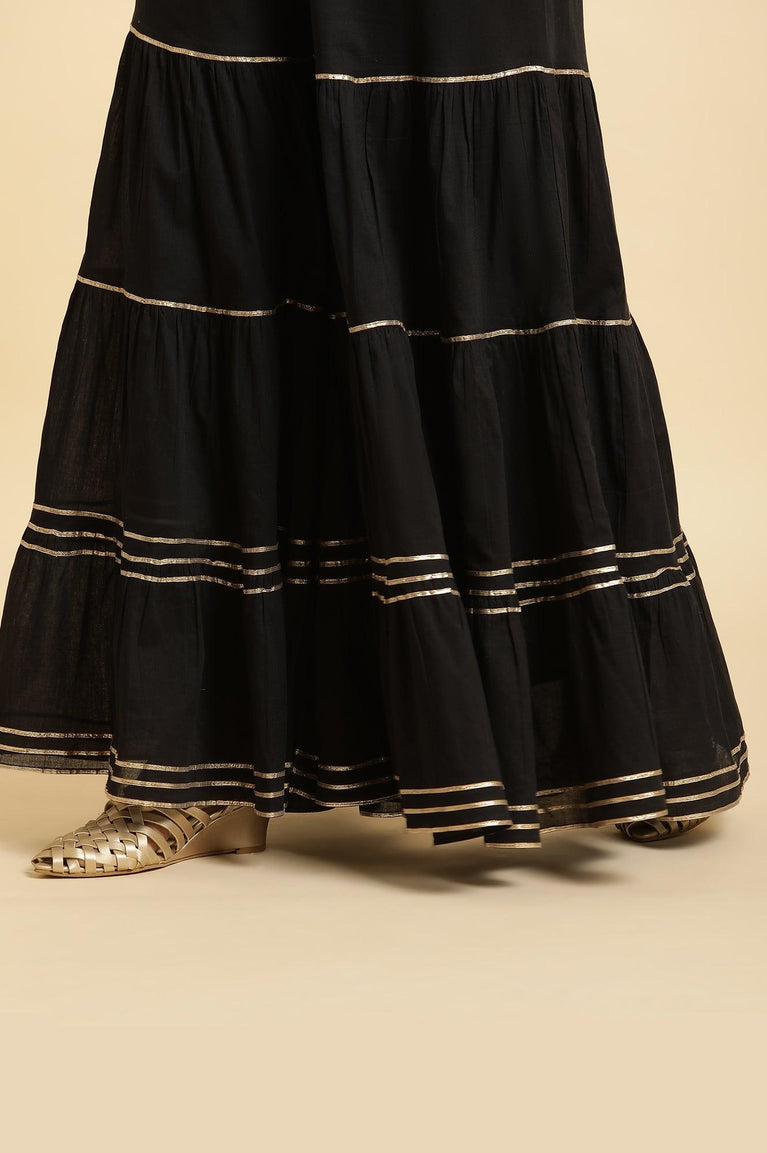 Black Tiered Sharara In Cotton Voile With Delicate Gathers And Gota Detailing. The Flowy Silhouette Has A Half Elasticated Waist That Ensures A Comfortable Fit.