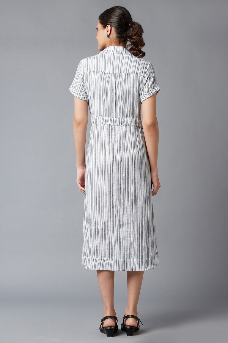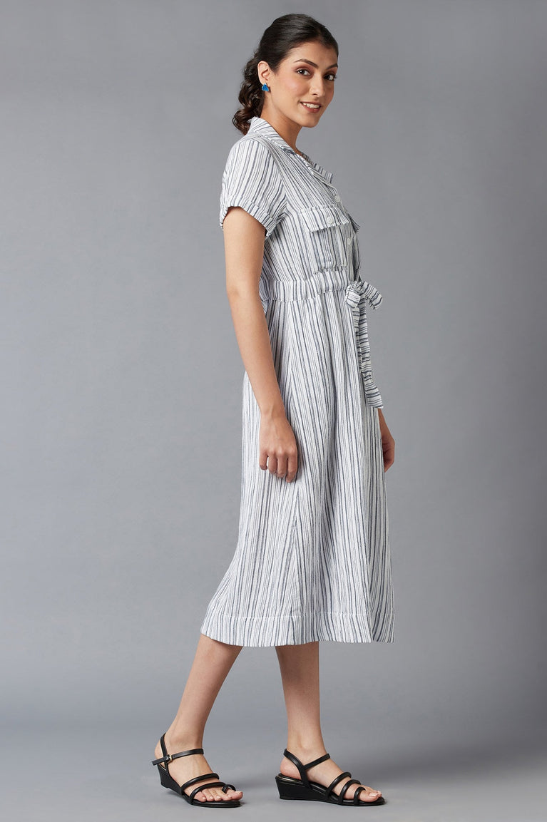 Discover our elegant grey A-line dress, a perfect fusion of comfort and style for your casual wardrobe. This versatile piece is crafted from 100% pure cotton, ensuring breathability and softness for all-day comfort. The dress features a sophisticated striped pattern, adding a touch of visual interest to its classic design. With its flattering A-line silhouette, it's suitable for various body types and occasions. The half-sleeve length provides just the right amount of coverage, making it ideal for transitional seasons. The notch neckline adds a unique and stylish detail, elevating the overall look of the dress. Constructed using a woven technique, this dress offers durability and a beautiful drape. It's the perfect choice for those who appreciate a blend of traditional and modern elements in their clothing. Whether you're heading to a casual gathering or running daily errands, this dress will keep you looking effortlessly chic and feeling comfortable.