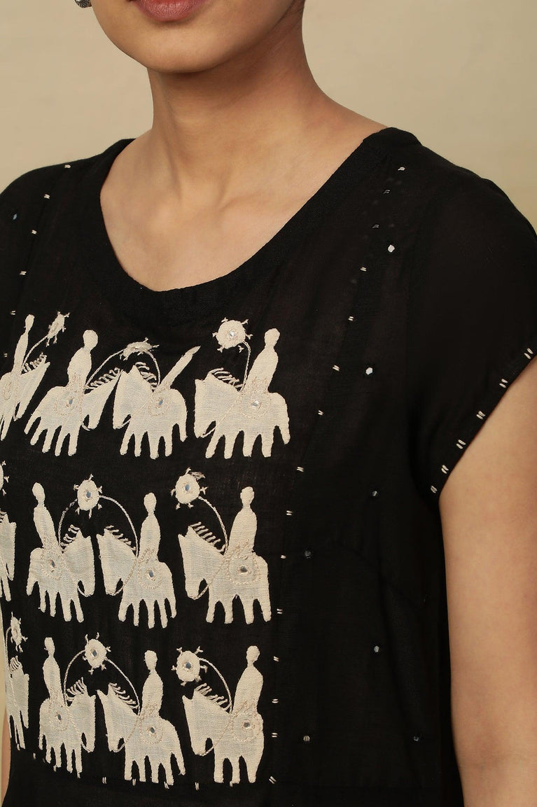 A Beautifully Crafted Flared Dress In Black Modal Flax. Features Meticulously Designed Hand Done Applique Embroidery At Front Yoke ,Highlighted With Kantha And Mirror Work. Enhanced With Nice V Shape Cut And Tie -Up Detail At Back.