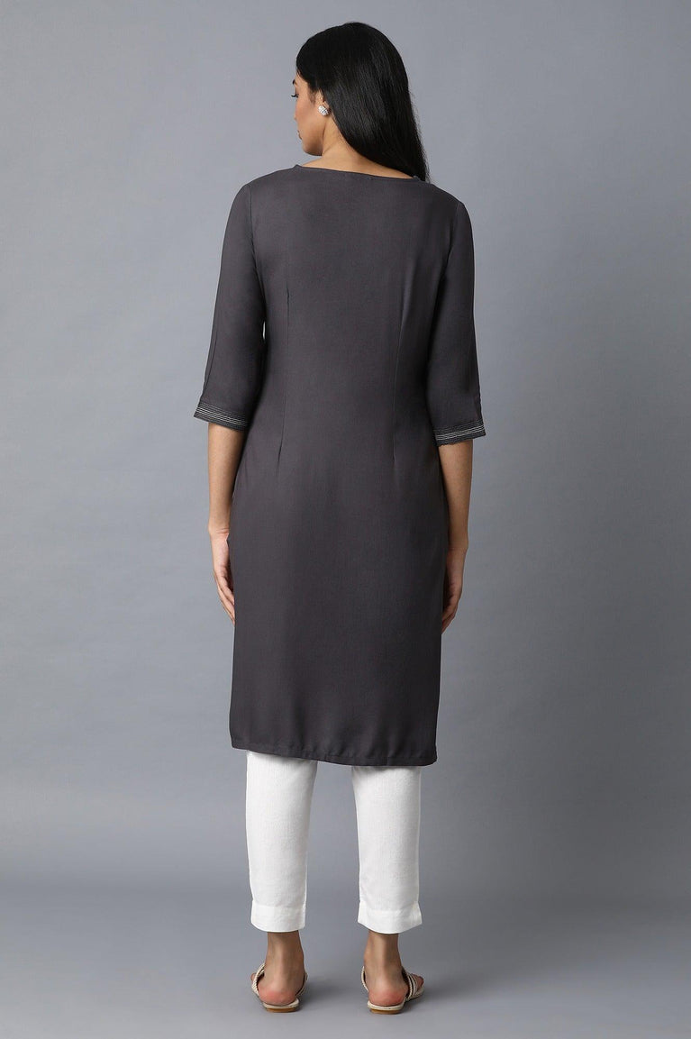Dark grey solid kurta having vertical floral embroidery on yoke. The kurta features key hole neck line, thread embroidery and three-quarter sleeves.