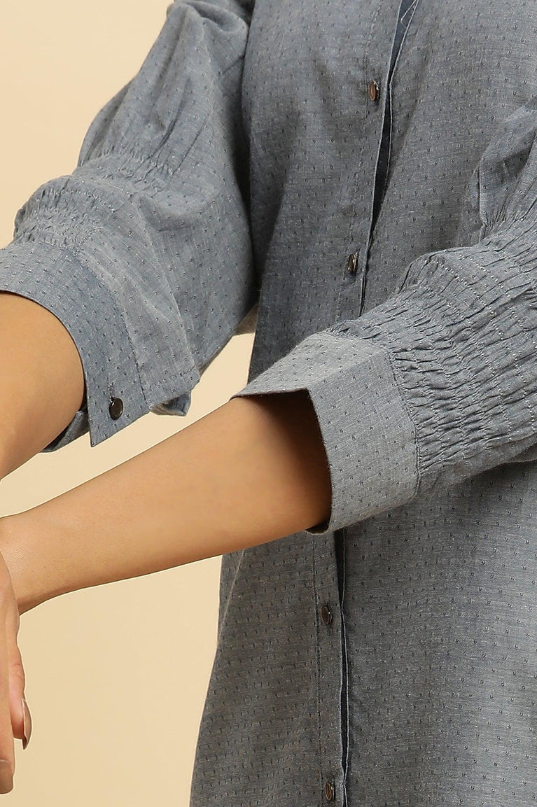 Elevate Your Casual Look In This Classy Blue Shoulder Embroidered Tunic. It Has Mandarin Collar And Button Placket.