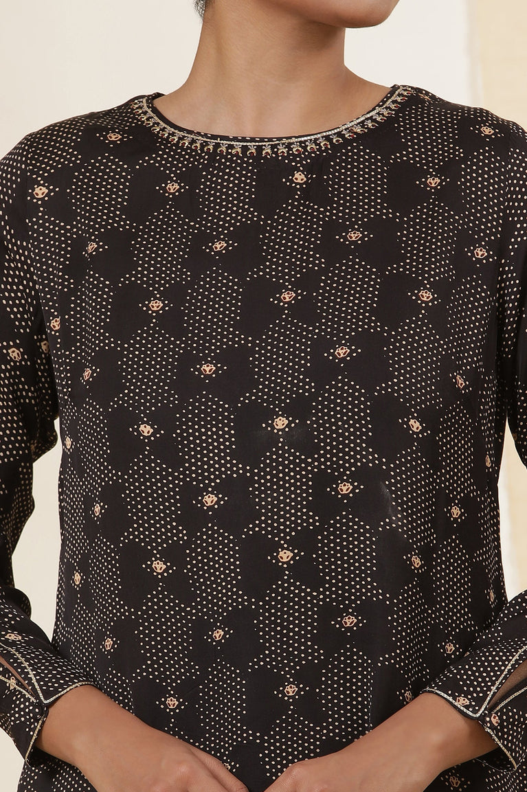 This black and off-white round neck 3/4 sleeve kurta has printed and embellished detail, a button with keyhole detail on the back and side slits.