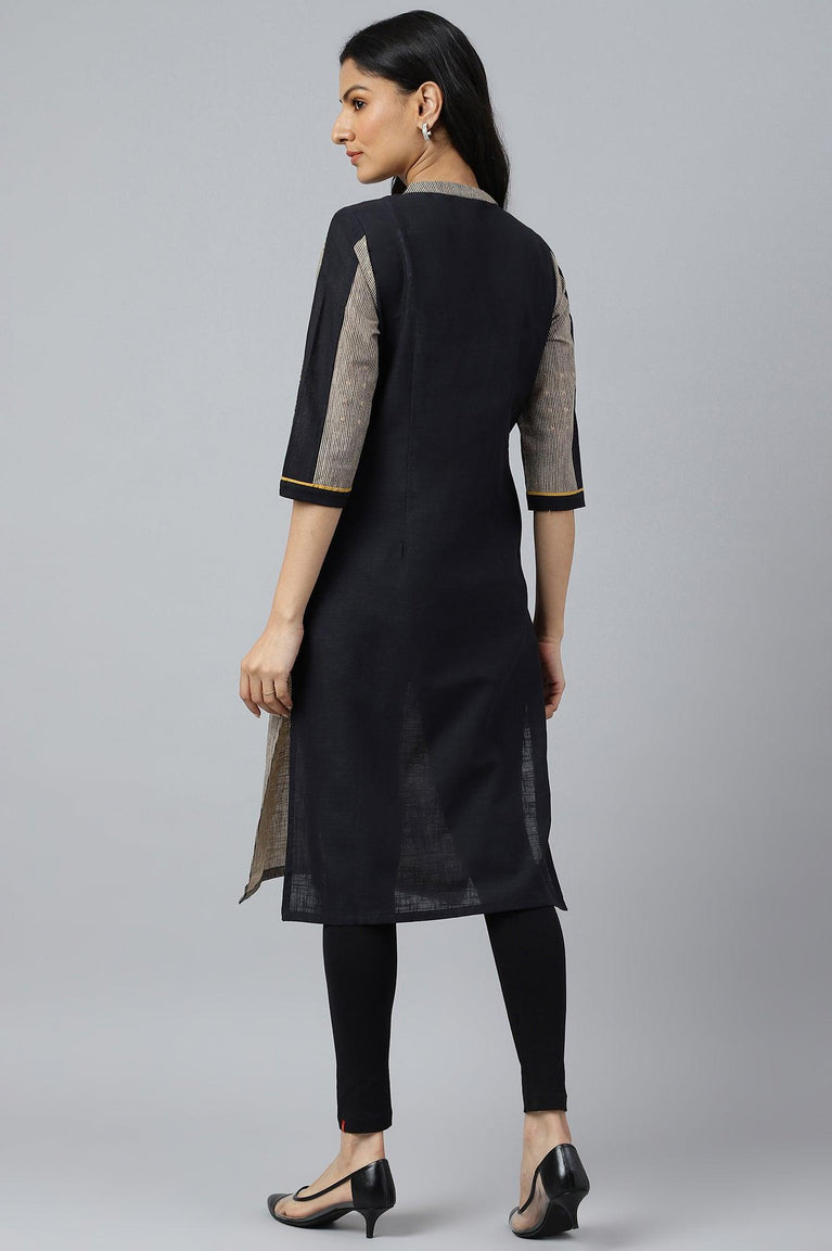 This black and aqua blue boat neck 3/4 sleeve kurta has printed detail, side slits and straight hem.