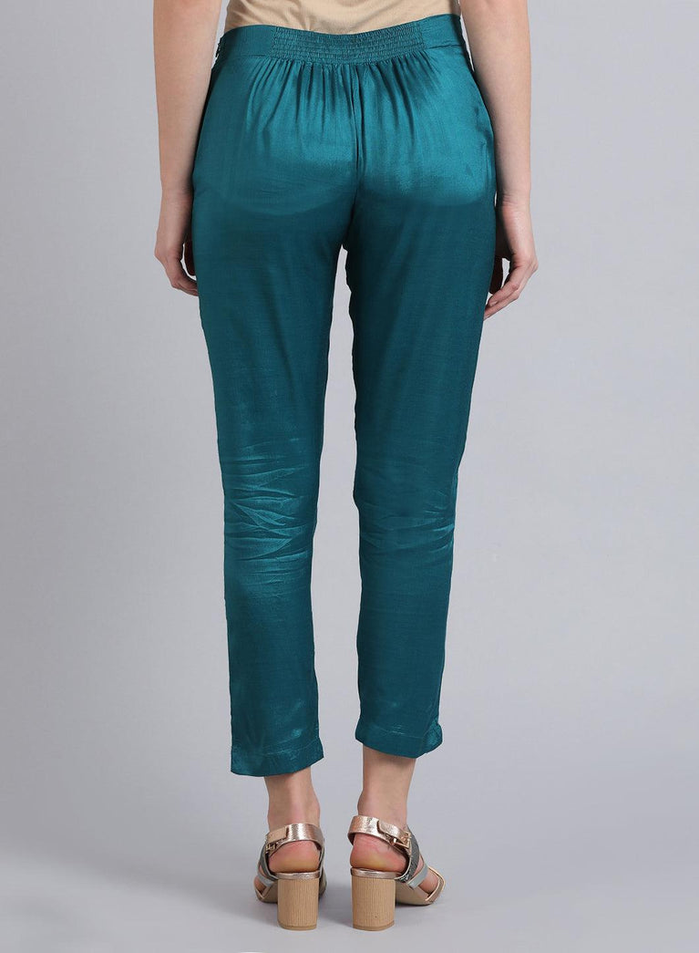 Blue ankle length trousers with elasticated back. It is made up of viscose & polyester.
