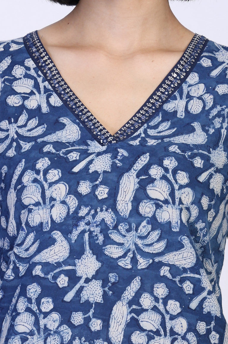 Blue Block Print Mirror Work Straight Cotton Kurta