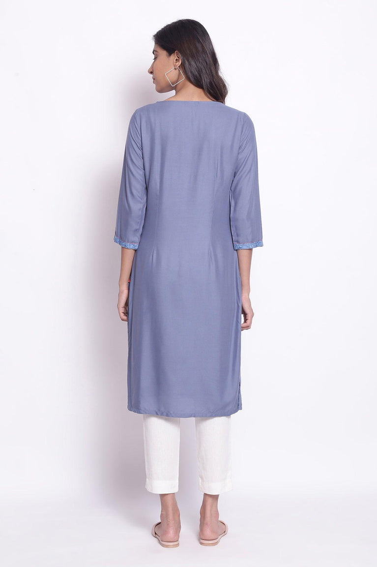 Blue shadow straight kurta in round neck and three-quarter sleeves, with embroidered yoke.