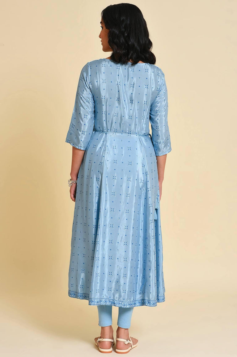 Frost Blue Printed A-Line kurta With Side Tie Up And Sequin Highlighting On The Yoke And Sleeves.