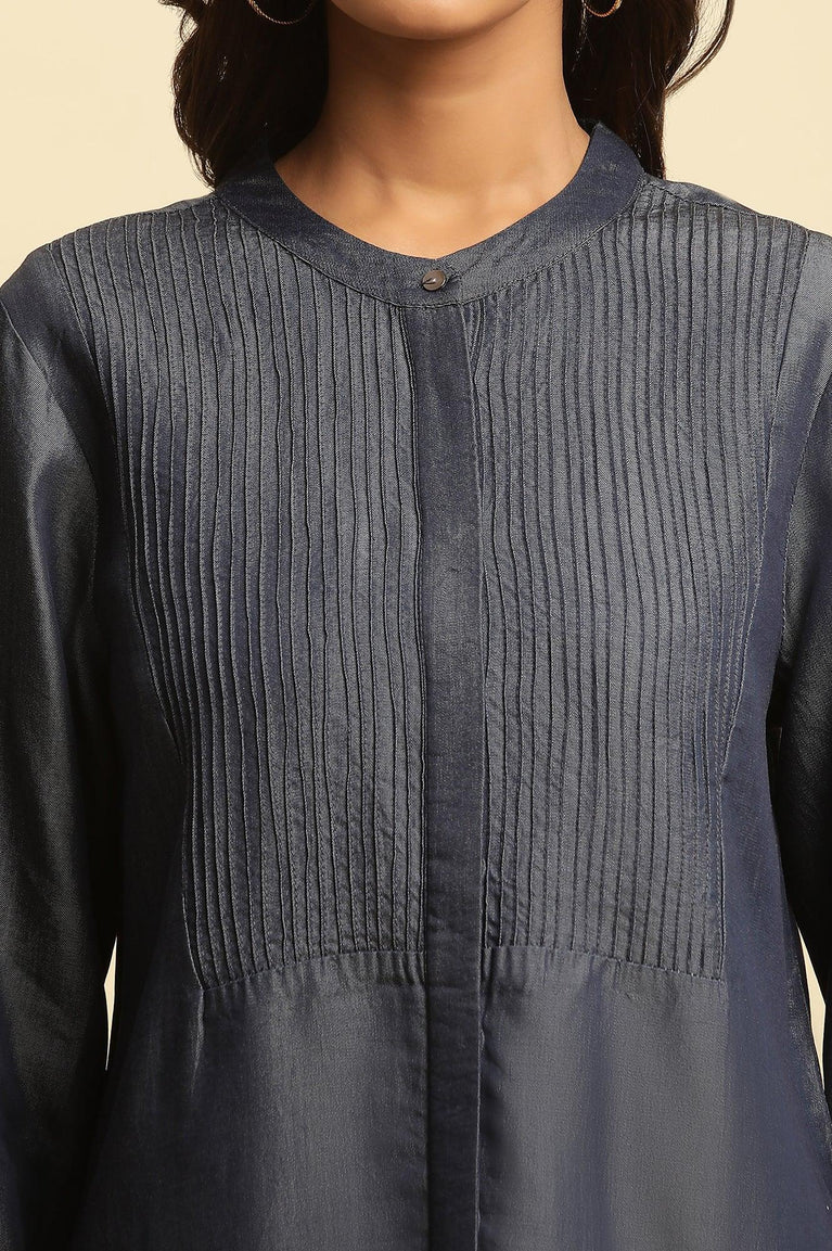 Longline Indigo Tencel Tunic. The Yoke Features Pin Tuck Detail With High Low Curved Hemline. The Kurta Has Mandarin Collar And Full Button Placket.