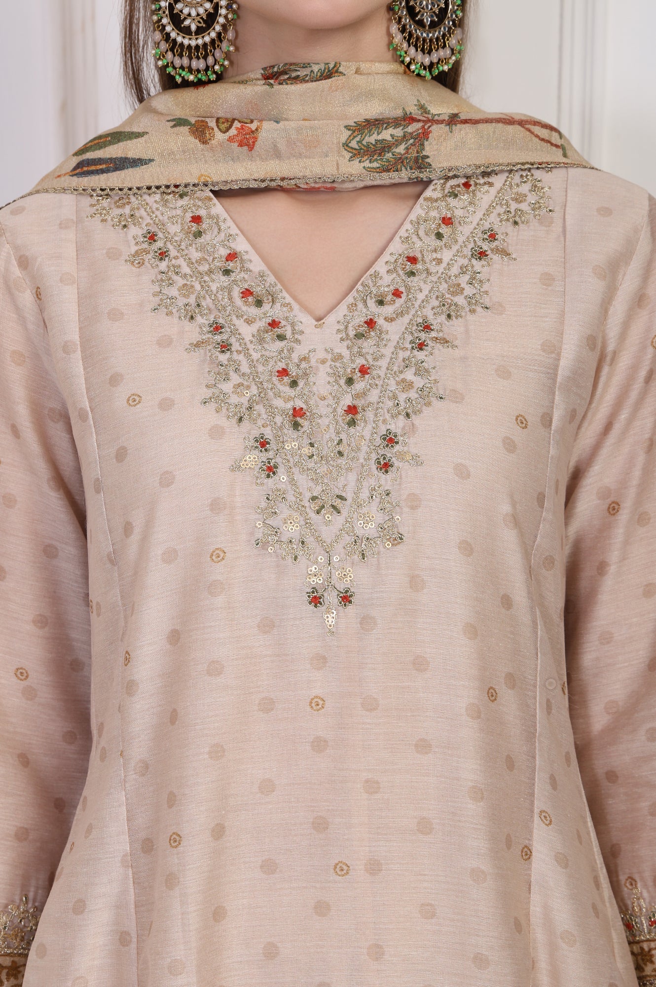 A vision of subtle opulence, this kurta set for women is crafted for moments that matter. The entire ensemble, rendered in a delicate Soft Fawn hue, centers around a graceful A-line kurta that glides with every step you take. Your eyes are immediately drawn to the V-neckline, which is framed by an exquisitely embellished yoke, shimmering with intricate floral embroidery and delicate sequins. This beautiful ethnic co-ord set showcases elegant three-quarter sleeves, finished with their own touch of matching embroidery at the cuffs for a harmonious feel. The kurta’s body is dotted with a subtle buti print, adding a layer of texture before culminating in a clean, straight hemline for a balanced silhouette. It’s paired with comfortable straight pants in a matching solid tone, ensuring a seamless and elegant profile. The true masterpiece, however, might be the accompanying dupatta. Crafted from a light, airy tissue, it features a stunning, artistic floral print with a beautifully detailed border. This complete kurti set, including the A-line tunic, straight pants, and printed dupatta, is a perfect choice for festive gatherings, elegant daytime events, or celebratory dinners where you want to shine with understated grace. The fabric is fully opaque, ensuring graceful coverage and confidence.