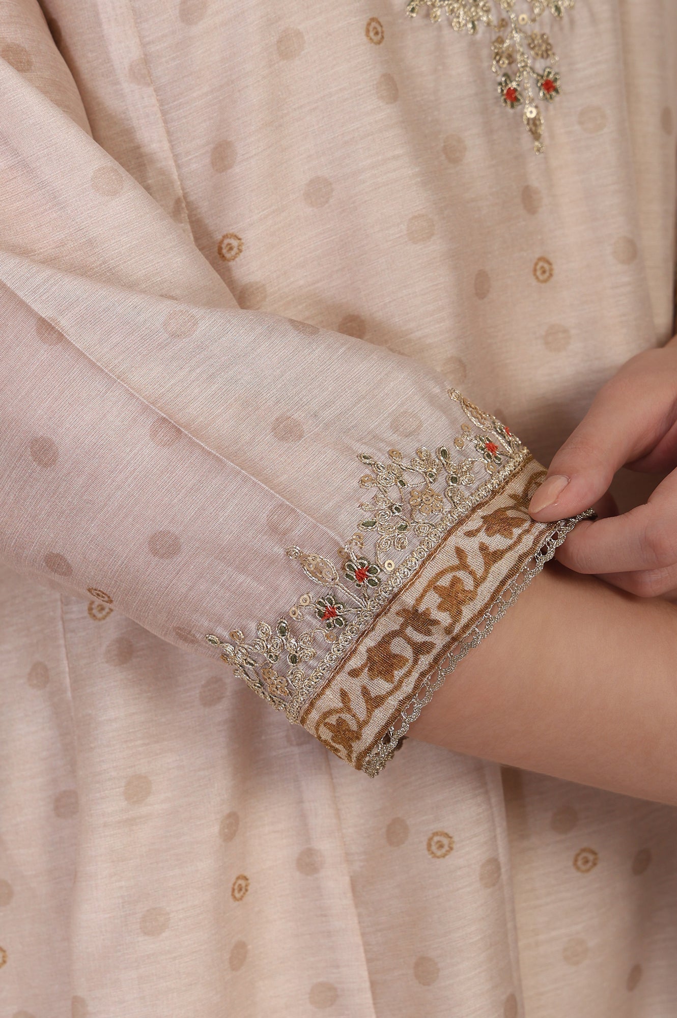 Beige Embroidered A-Line Chanderi Kurta with Straight Pant and Dupatta Set