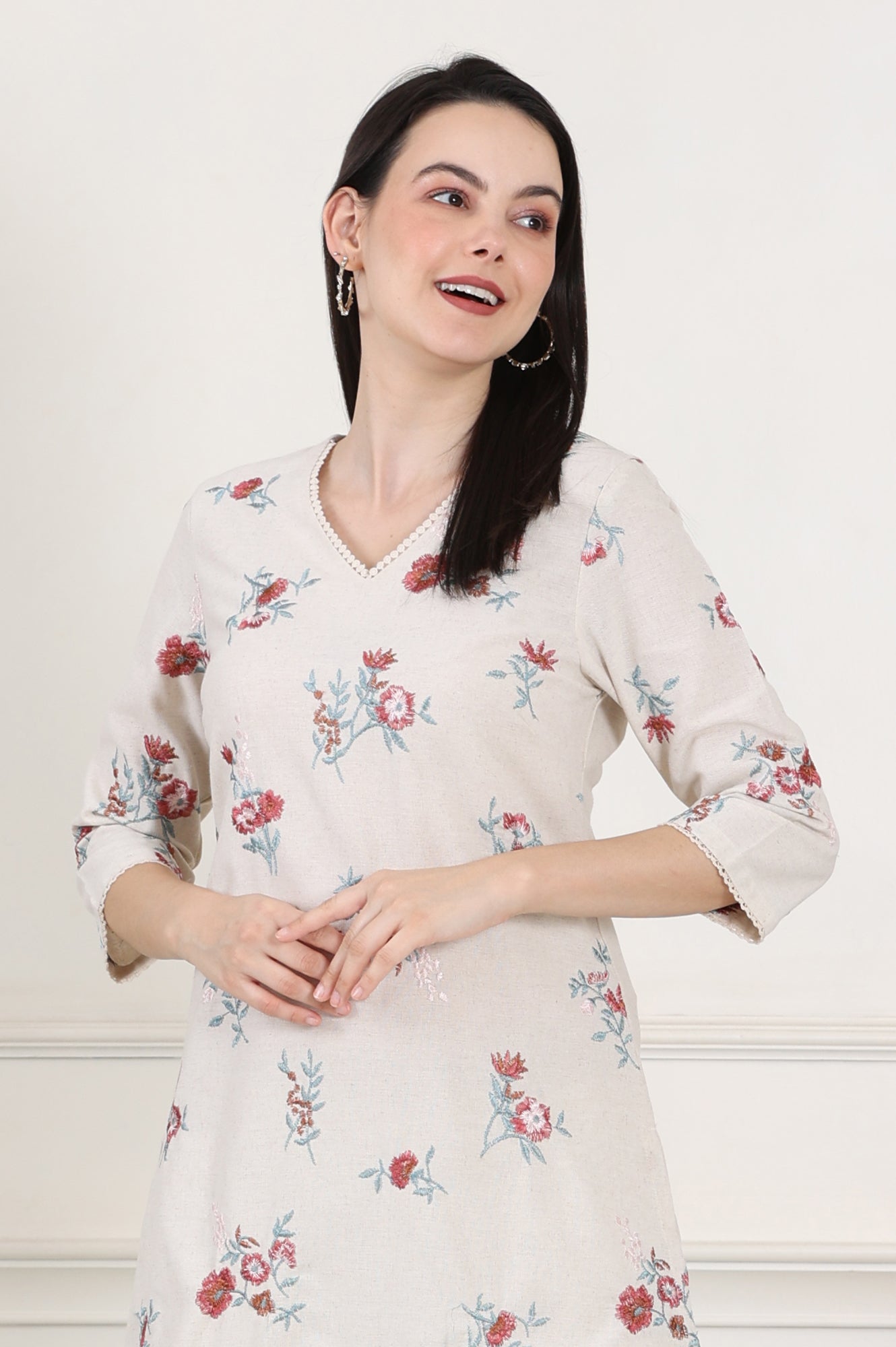 Beige Linen Straight Kurta With Multi-Coloured Thread Work