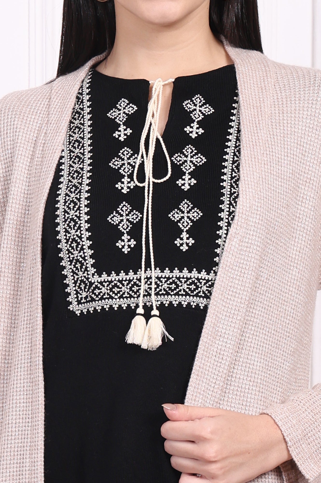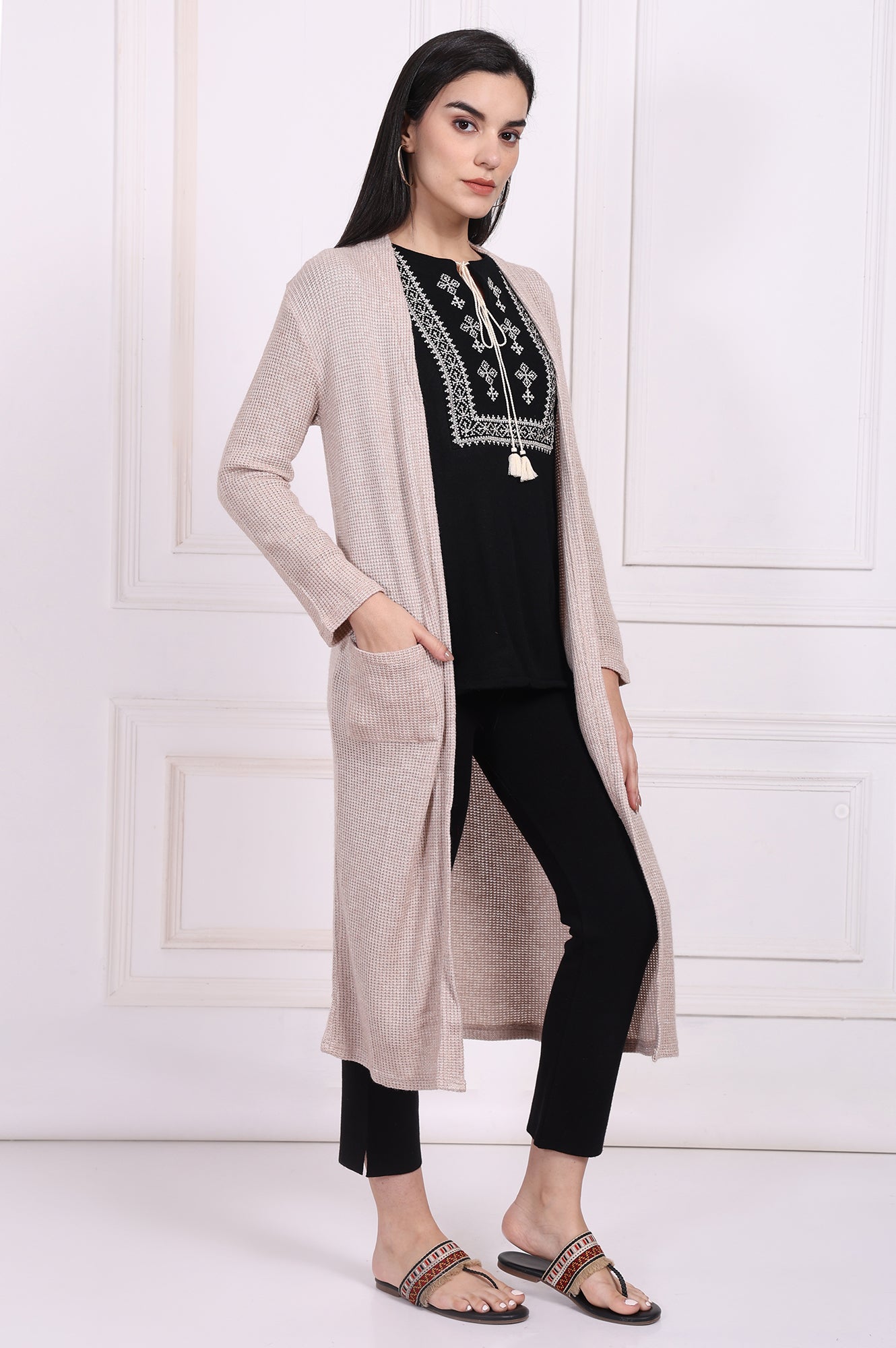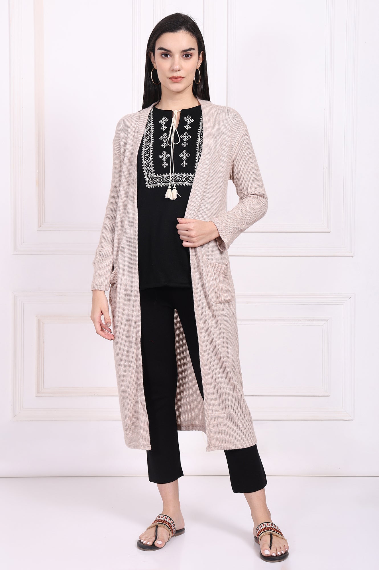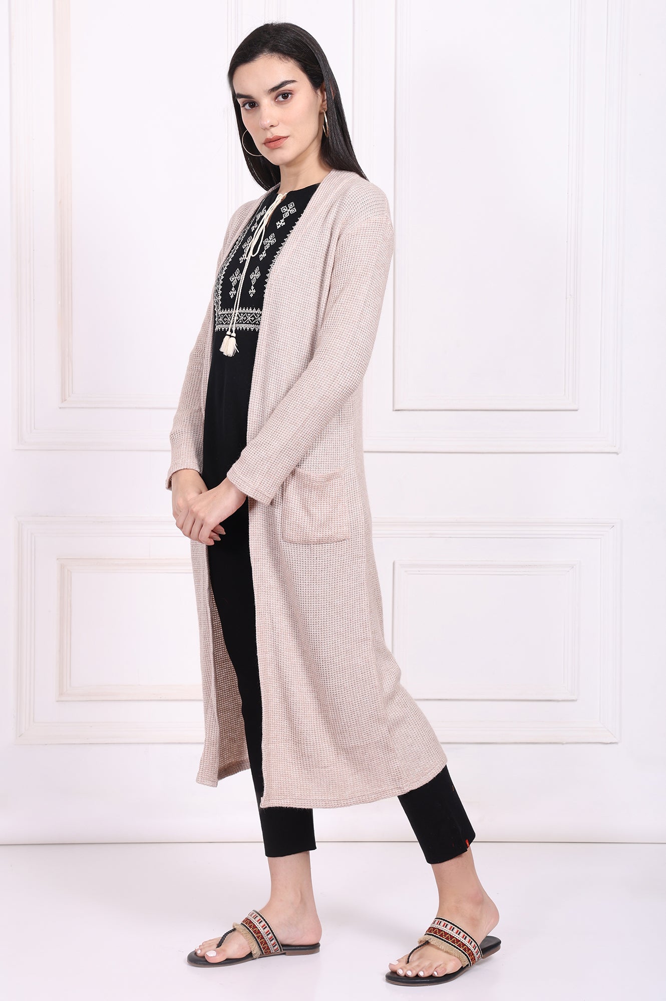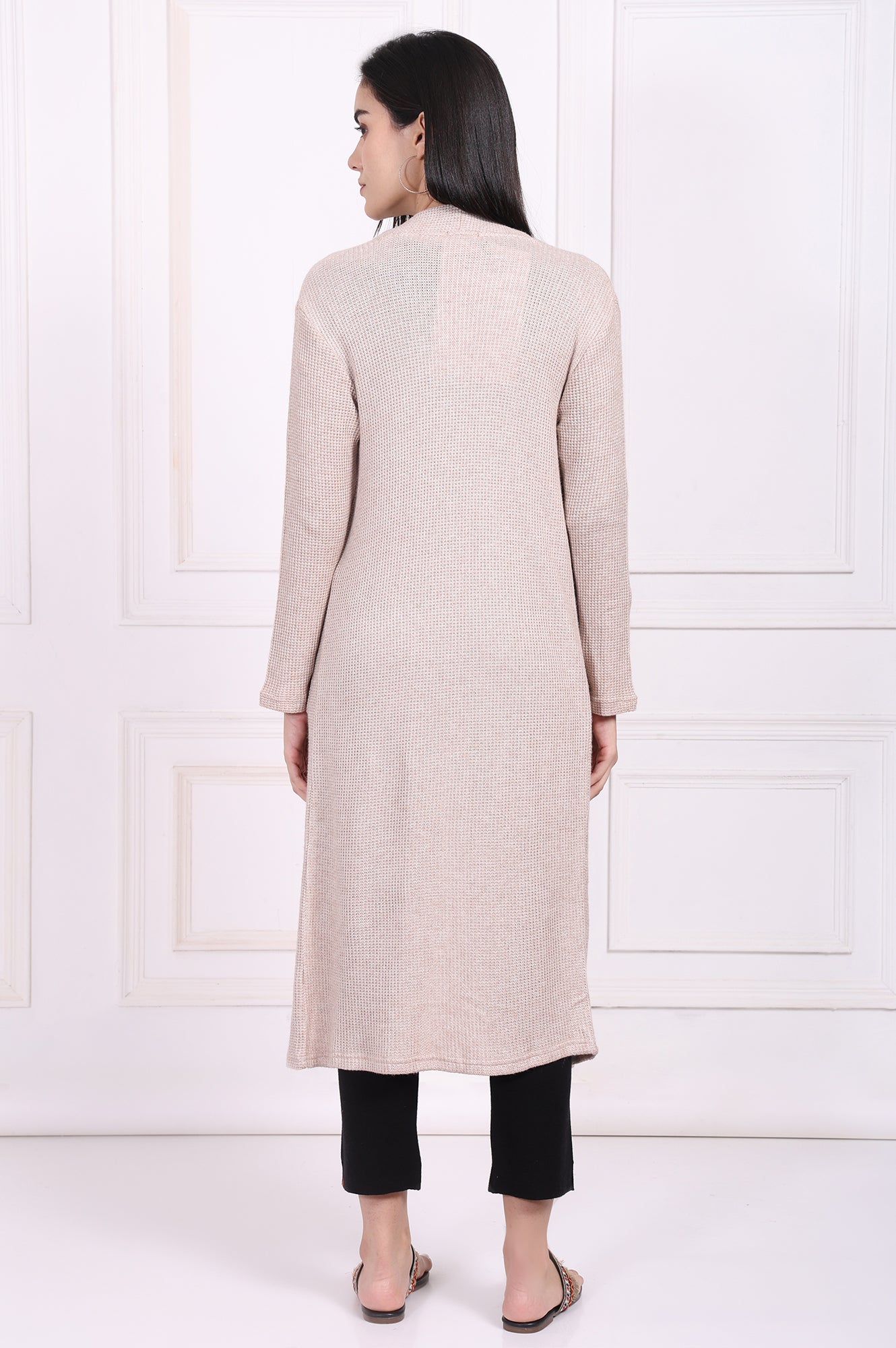 A whisper of warmth and style, this jacket is your new essential for effortless layering. Designed in a serene Oatmeal Beige, this piece brings a touch of understated elegance to any look. This jacket for women features a flowing open-front design that creates a long, lean silhouette, complemented by a soft shawl collar that frames your top beautifully. You'll love the feel of the textured knit fabric, which offers both comfort and a visually interesting finish. It’s styled with full-length sleeves and a straight shape, ensuring it drapes just right without clinging. Two generously sized patch pockets are seamlessly integrated into the front, perfect for keeping your hands warm or stashing small essentials. The opaque fabric and straight hemline complete this minimalist design. Whether you're creating a chic work-from-home look or adding a final touch to a casual outing outfit, this versatile longline knit jacket is a must-have. Its simple yet refined aesthetic makes it an incredibly adaptable piece for any wardrobe, promising endless styling possibilities from season to season. It's the kind of apparel you'll reach for again and again.