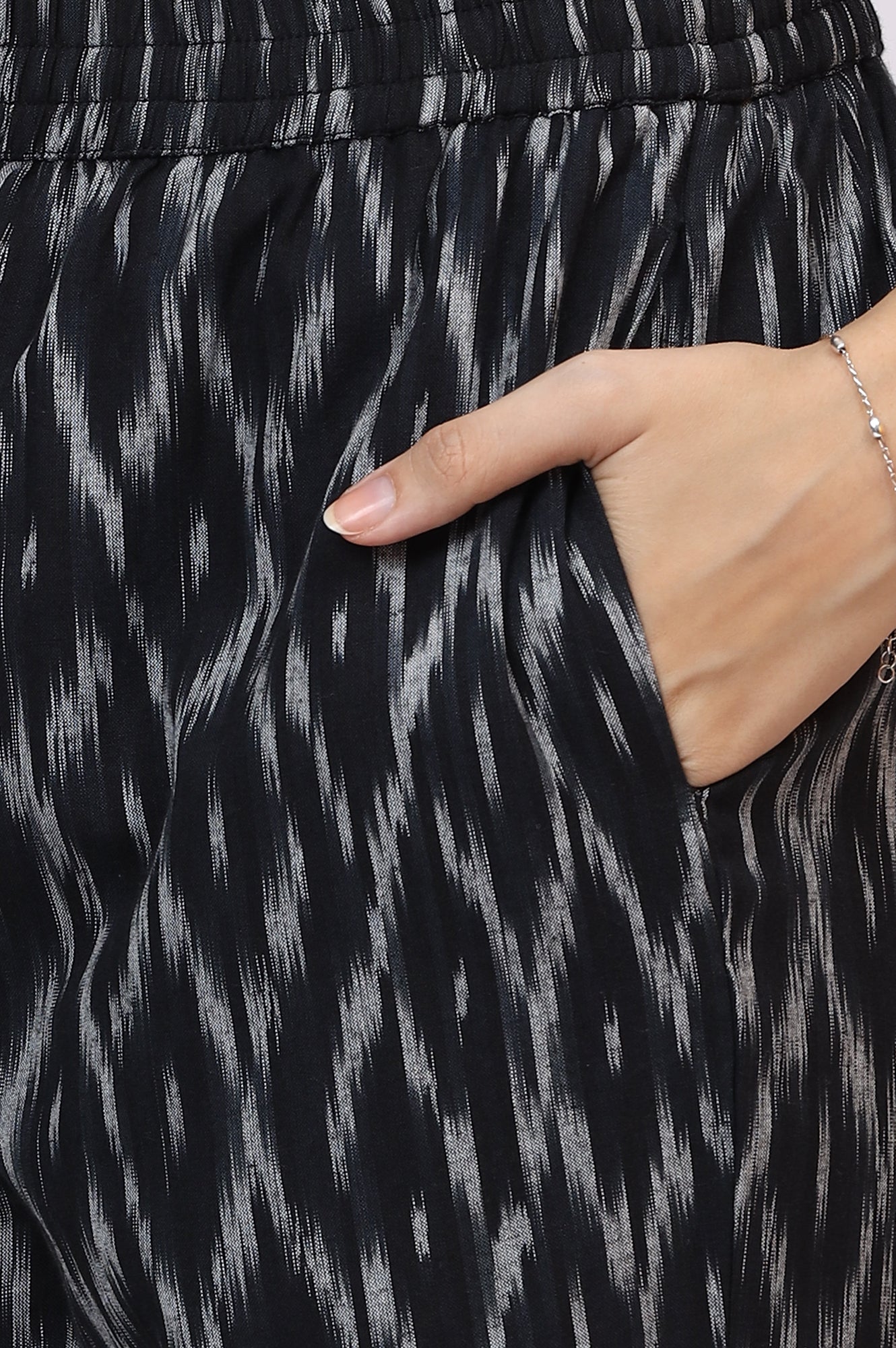 Elevate your ethnic wardrobe with this black ikkat kurta and pants Co-ord Set. Crafted from soft and breathable pure cotton, this ensemble ensures all-day comfort while exuding timeless elegance. The straight-cut kurta features a classic Ikat print, adding a touch of heritage charm, while the matching pants create a seamless, well-coordinated look. Perfect for casual outings, office wear, or festive gatherings, this versatile set offers effortless sophistication.