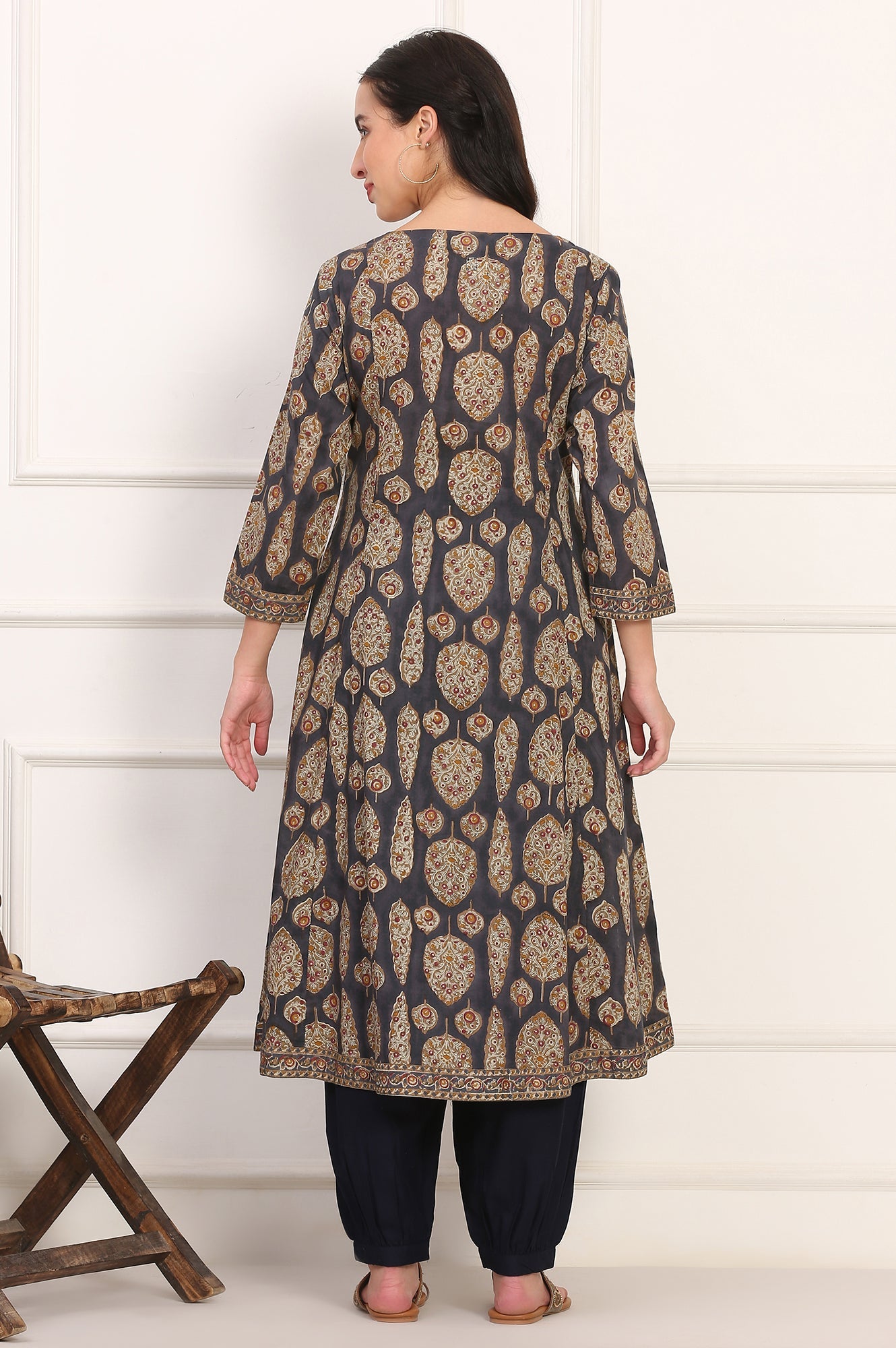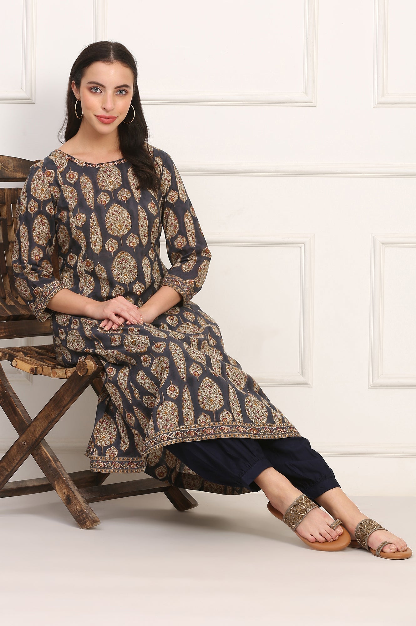 Effortlessly elegant and grounded in tradition, this blue aster pure cotton kurta for women by Folksong brings a touch of timeless charm to everyday ethnic dressing. Cut in a straight silhouette with a regular fit, it features a classic round neckline and 3/4th regular sleeves for a balanced look. The kurta is tastefully adorned with an all-over floral print and delicate mirror work, adding subtle festive appeal. Crafted in breathable, 100% pure cotton fabric, it ensures comfort across warm-weather days. The knee-length design with no slit makes it versatile for styling with a variety of bottomwear options. Whether chosen for casual outings or everyday office wear, this kurta blends comfort and style with effortless grace, making it a must-have wardrobe staple.