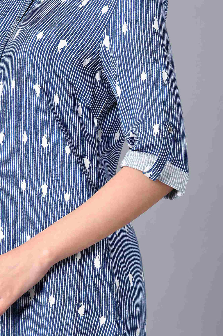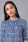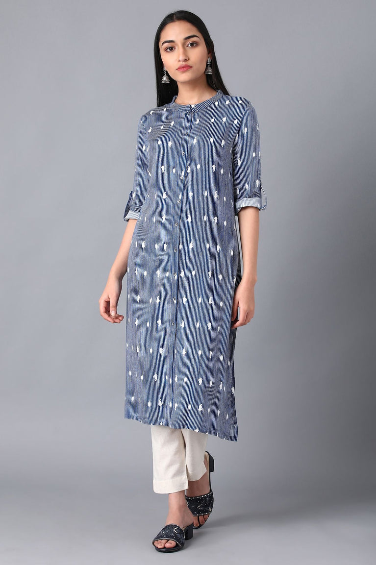 Blue mandarin neck kurta with printed detail and button placket detail.