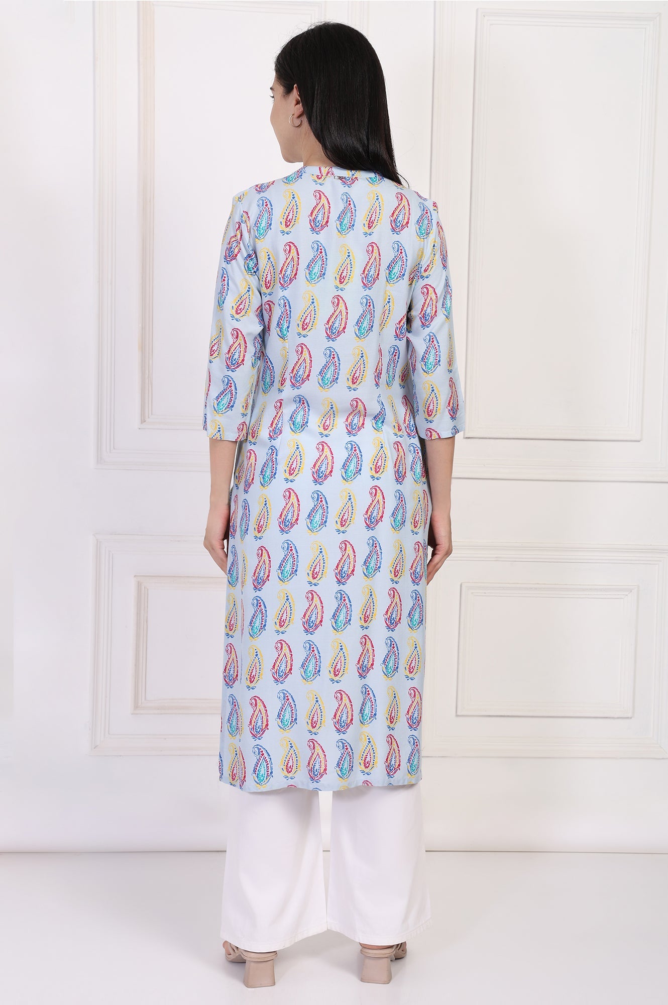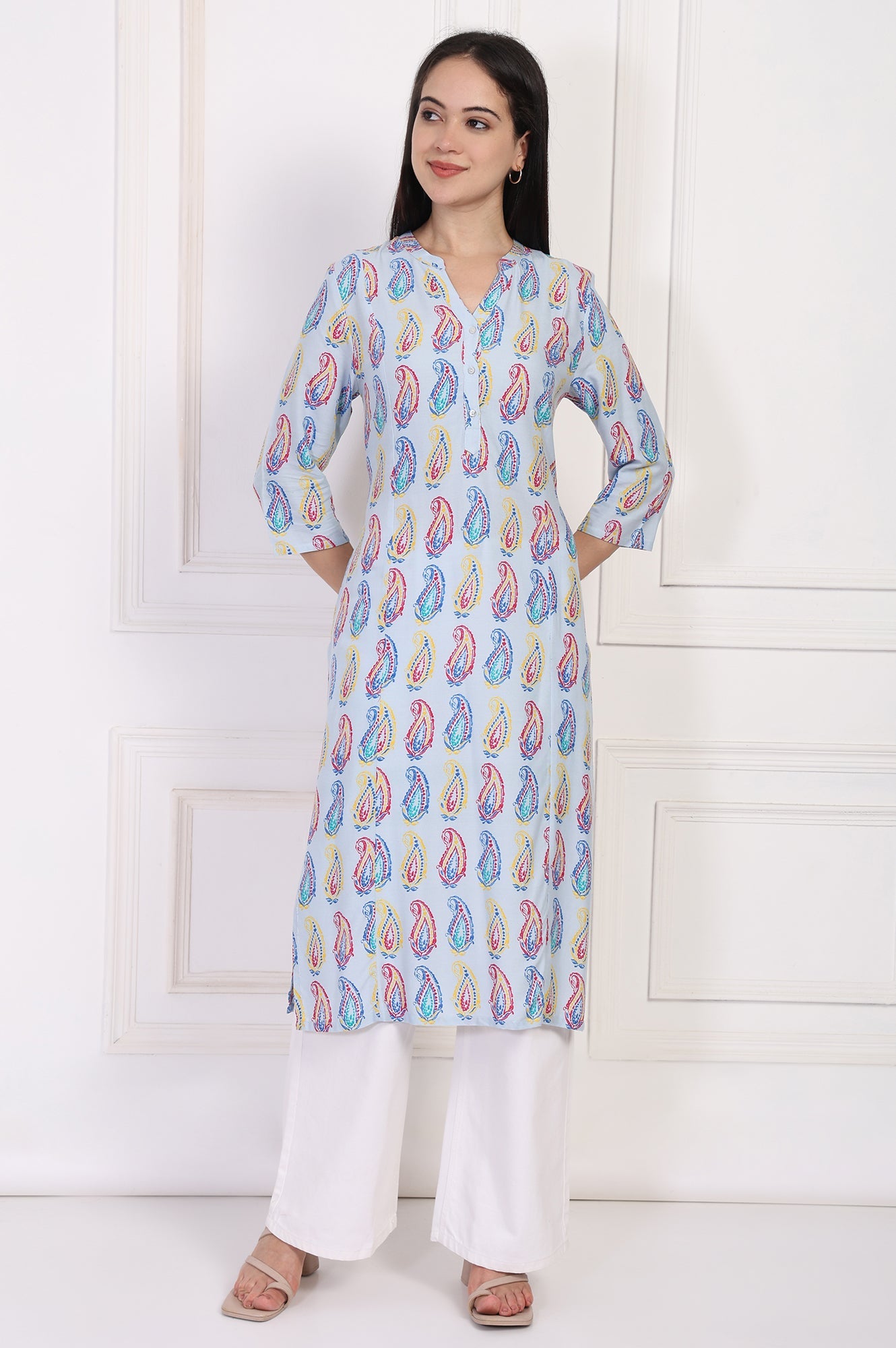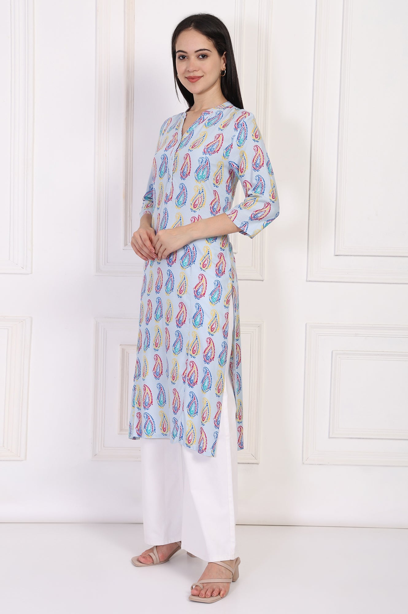 A canvas of classic artistry, this kurta for women is rendered in a refreshing Sky Paisley Blue, bringing a touch of handcrafted charm to your wardrobe. The design celebrates timeless motifs with its vibrant, all-over paisley print, making this tunic a standout piece of apparel for any casual occasion you have planned. You'll love how it's shaped into a graceful straight silhouette that flatters every form, ending in a classic straight hemline complete with side slits that offer beautiful movement and all-day ease. The neckline is a thoughtfully designed Mandarin collar, which flows elegantly into a V-placket detailed with a row of delicate, contrasting buttons on the yoke for a hint of ornamentation. Its three-quarter sleeves provide comfortable and chic coverage, perfect for transitional weather. Crafted from a fabric that glides effortlessly and feels soft against the skin, this light blue ethnic tunic is fully opaque, ensuring total confidence with every wear. It’s the perfect paisley print kurta to pair with crisp white trousers or your favorite denim for a look that's both sophisticated and wonderfully easygoing. This single-pack kurta is a testament to understated style, blending traditional patterns with a modern, wearable cut.