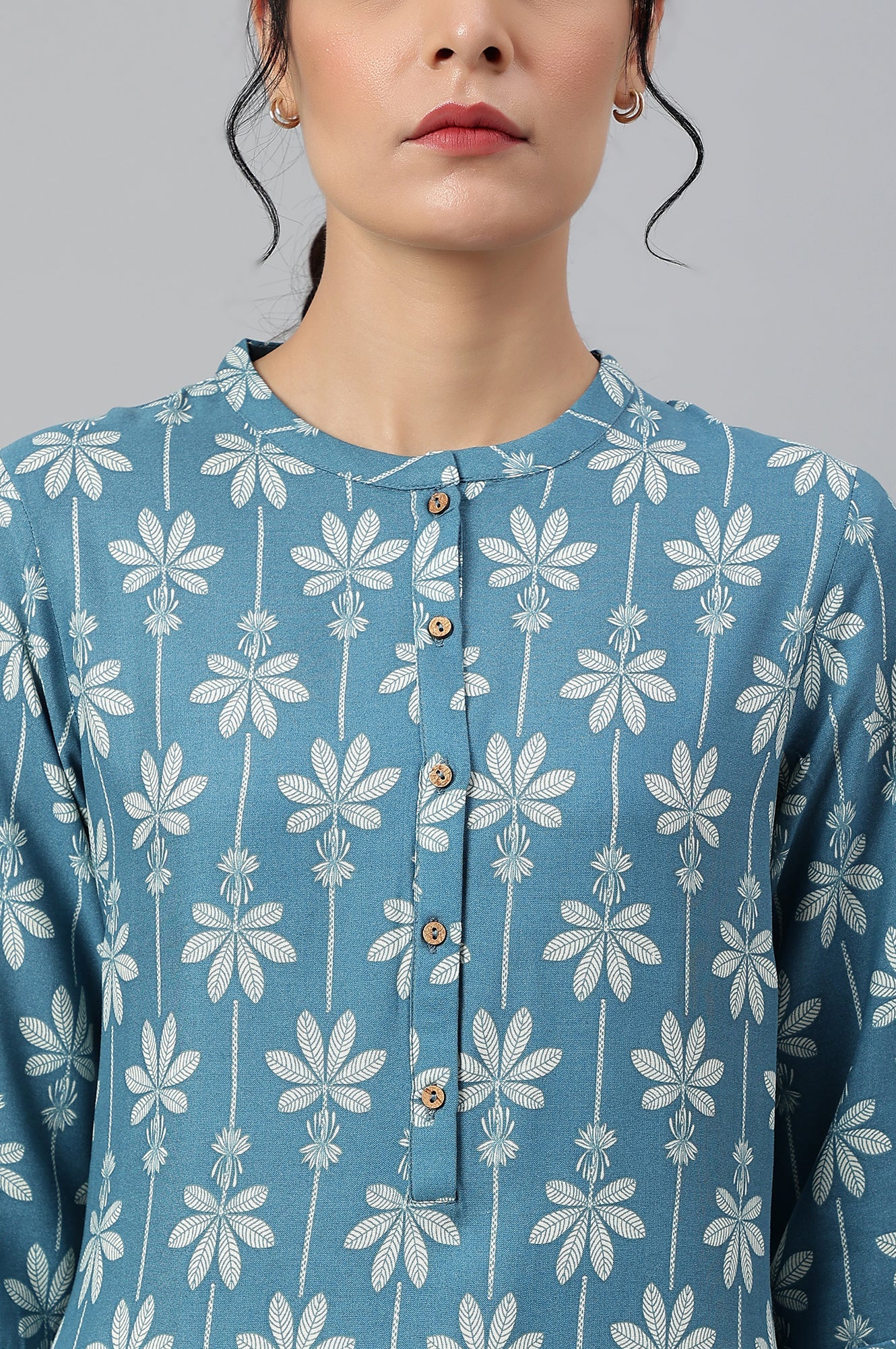 All Over Palm Printed Button Down Kurta With Quarter Sleeves And Tab Detail