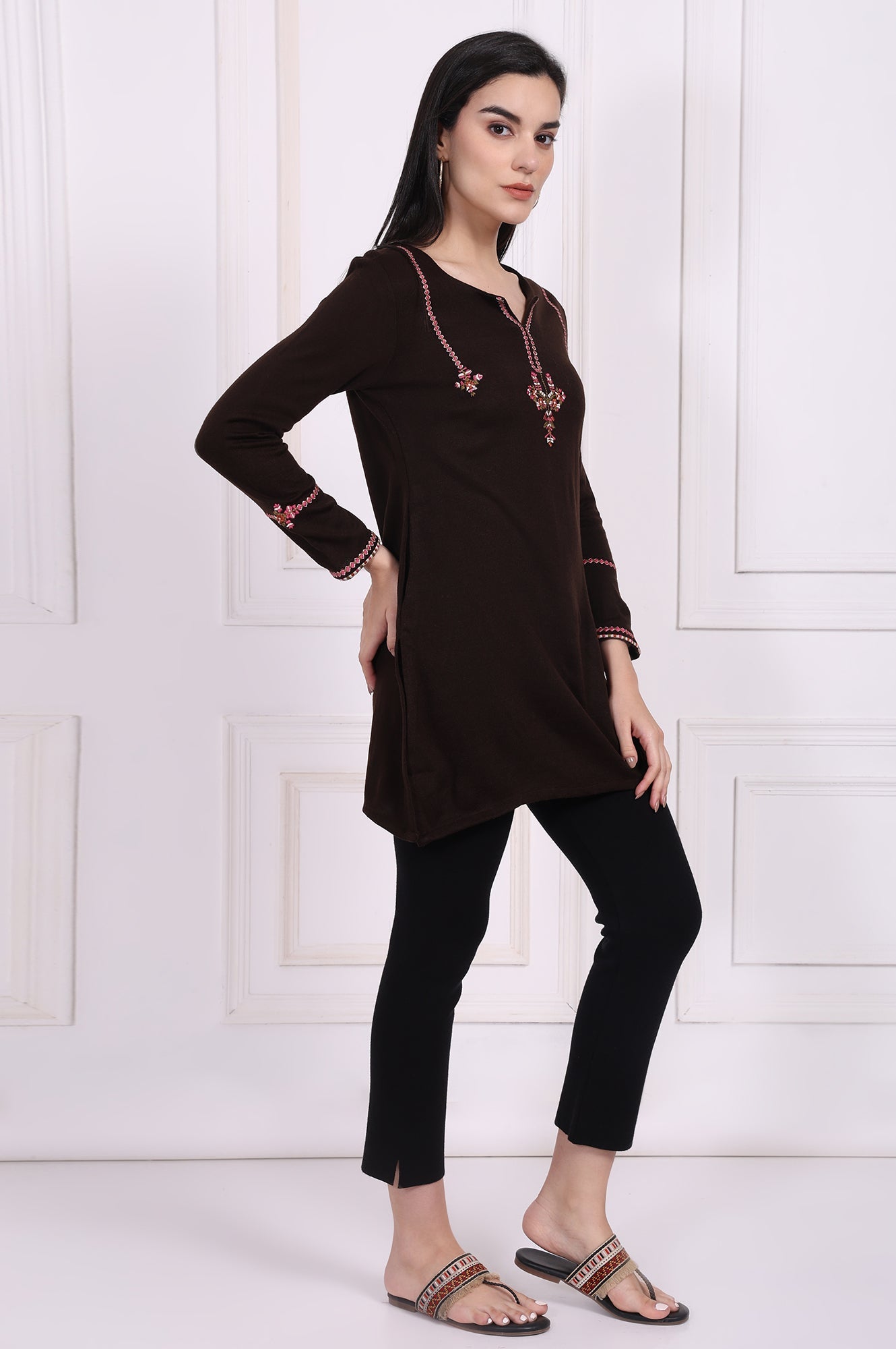 Warmth meets artistry in this beautifully crafted tunic for women, a sublime choice for navigating the cooler seasons with grace. Rendered in a deep, earthy tone that evokes a sense of grounded elegance, this apparel is a testament to contemporary ethnic design. The silhouette is thoughtfully constructed, featuring a flattering notched V-neckline that draws the eye to the stunning, multi-hued thread embroidery gracing the yoke. This intricate ornamentation, a delicate dance of floral-inspired motifs, is tastefully mirrored at the cuffs of the cozy full-length sleeves, creating a harmonious and polished look. As an essential piece of ethnic wear for women, it's designed in a timeless straight cut that drapes beautifully over the frame. This classic shape ensures comfort and unrestricted movement, which is thoughtfully enhanced by the inclusion of side slits at the straight hemline. The fabric is completely opaque, offering modest coverage and a confident feel throughout the day. Hidden within the seams are discreet pockets, a practical touch that adds to the tunic's everyday appeal. This brown embroidered winter tunic is more than just a garment; it's a versatile statement of style, perfect for casual outings, office wear, or intimate festive gatherings. You'll find yourself reaching for this elegant straight acrylic kurti again and again.