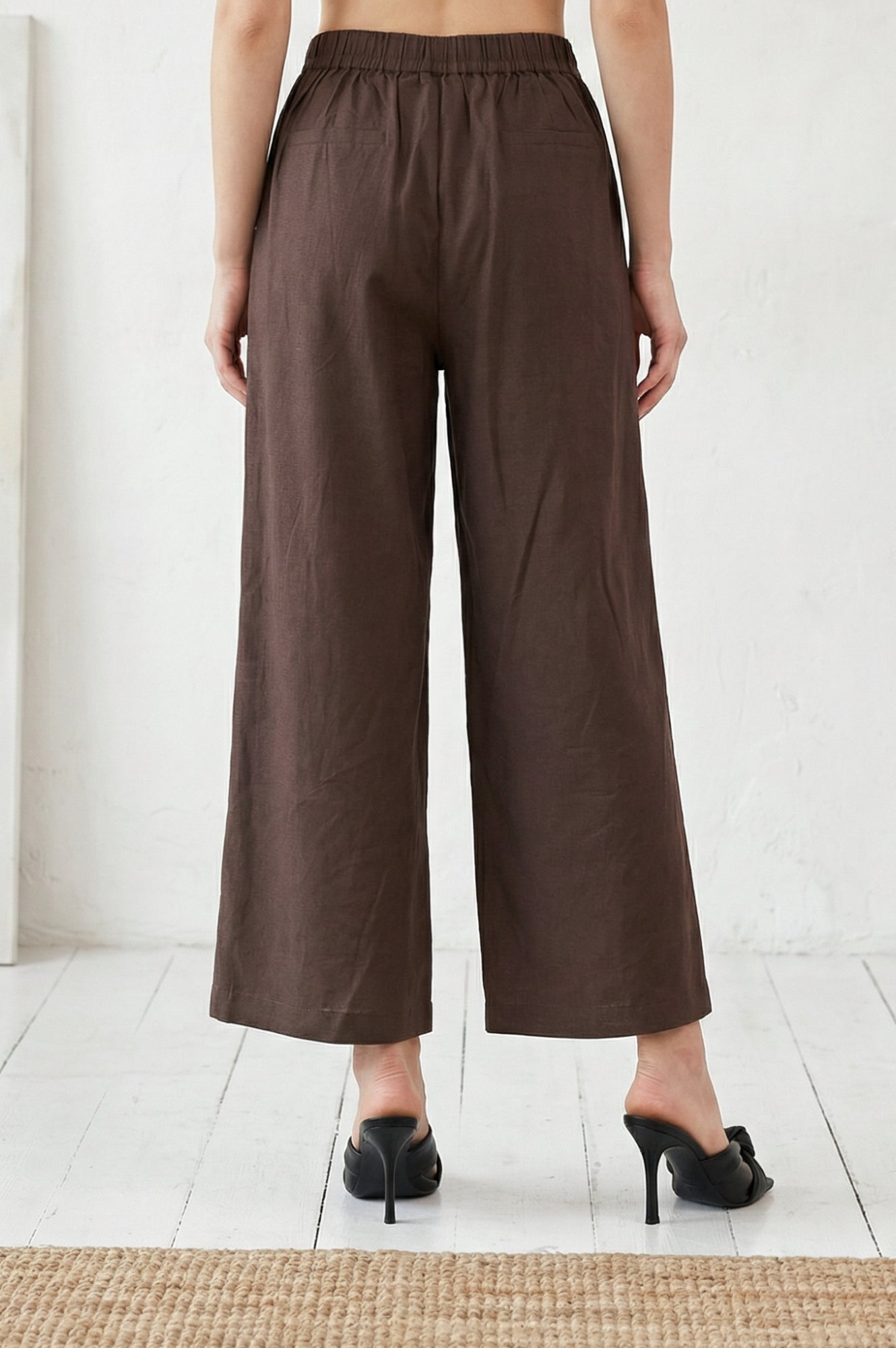 Tailored in a breathable flax blend, these brown wide-leg pants for women offer an effortlessly chic silhouette for both smart casual and relaxed outings. Designed with a high-rise, partially elasticated waist and a flat-front finish, this solid woven palazzo ensures all-day comfort while maintaining a refined look. Featuring an ankle-length cut, neat button details, and four practical pockets, it seamlessly transitions from office wear to casual street style. Pair this minimalist ethnic wear staple with your favorite tops or kurtas for a sophisticated summer ensemble.