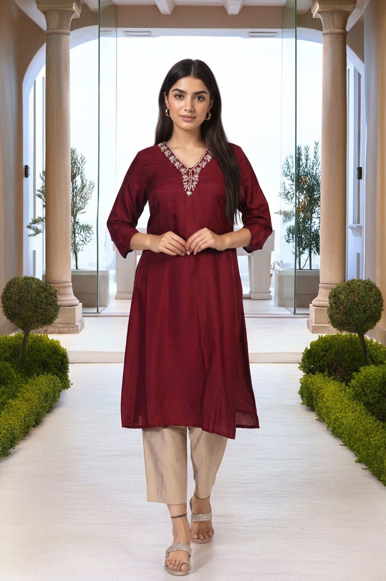 Here is the silhouette that flatters while it flows, a piece designed for the modern woman who cherishes timeless elegance. This beautiful kurta for women is presented in a sumptuous deep wine color, crafted from a material that catches the light with a subtle, rich sheen. The A-line shape glides effortlessly over the body, creating a silhouette that is both graceful and comfortable for long hours of celebration. All eyes will be drawn to the exquisite yoke, where intricate embroidery in contrasting tones frames the V-neckline, lending the piece an air of artisanal luxury. This ornamentation is the star, a perfect example of detailed craftsmanship. The kurta features elegant three-quarter sleeves and is fully opaque, ensuring complete comfort and confidence. Its straight hemline is punctuated with classic side slits, allowing for graceful movement. As a standalone piece, this festive tunic offers endless styling possibilities. It's the perfect choice for an evening soirée, a wedding reception, or any grand celebration on your calendar. Pair this party wear tunic with gilded accessories to complete your stunning look.