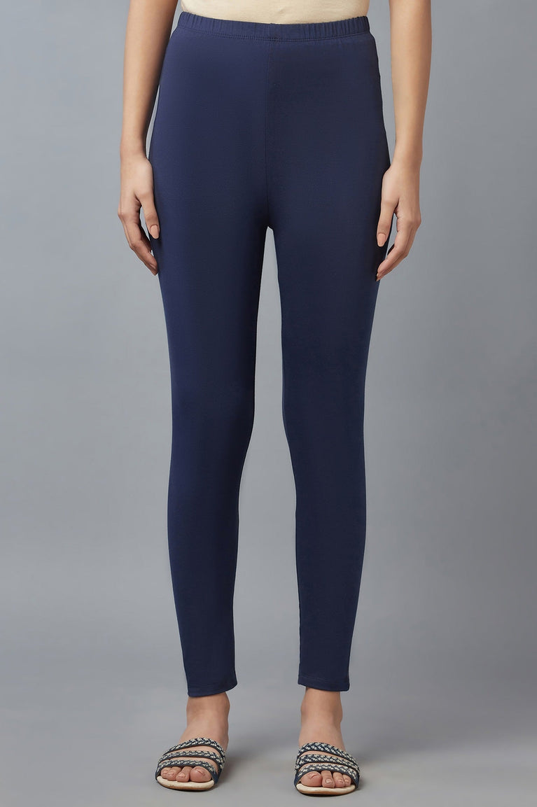 Navy Blue Solid Skinny Fit Cotton Tights With Elasticated Waistband