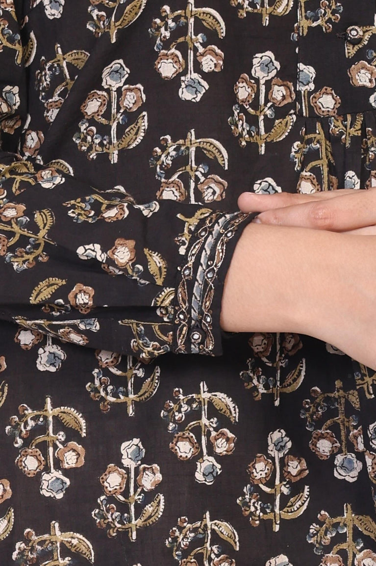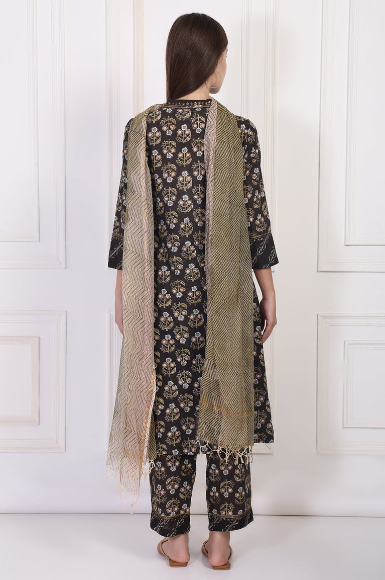 Black Floral Printed Embellished A-Line Cotton Kurta with Straight Pant and Dupatta Set