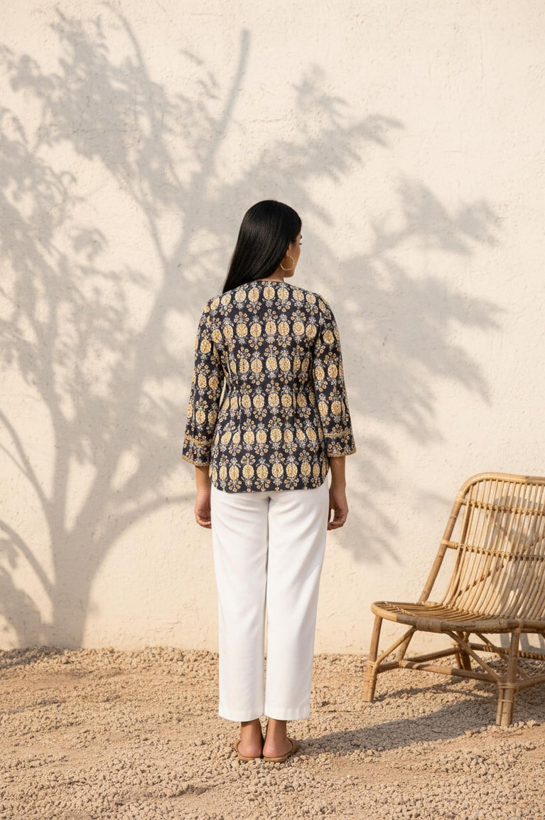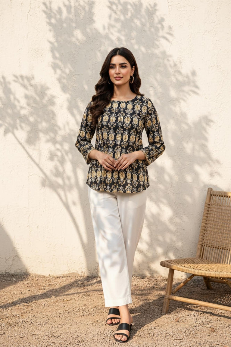 A timeless addition to your wardrobe, this black floral printed cotton top is perfect for any occasion. The soft cotton voile fabric ensures breathability and comfort, making it ideal for all-day wear. Featuring a round neckline and 3/4 sleeves, this top is designed with an elegant A-line silhouette that flatters every body type. The intricate floral print adds a touch of bohemian charm, while the lightweight material makes it perfect for casual outings, college wear, or festive gatherings. Pair it with white trousers or denim for a chic and versatile look.