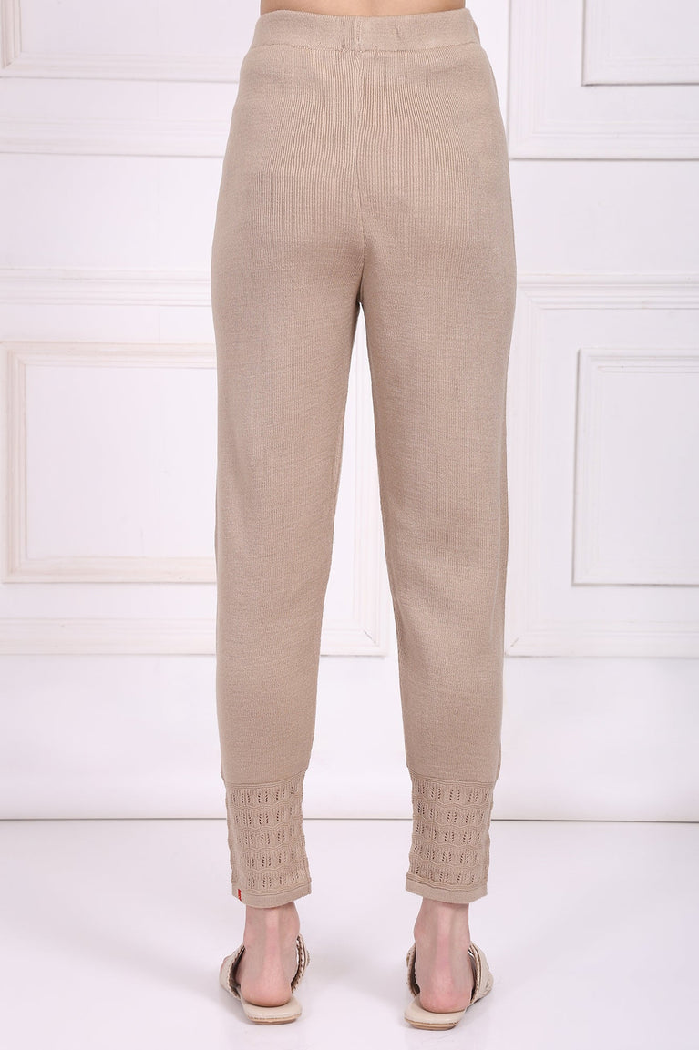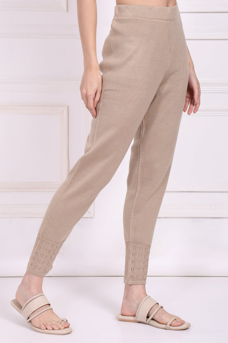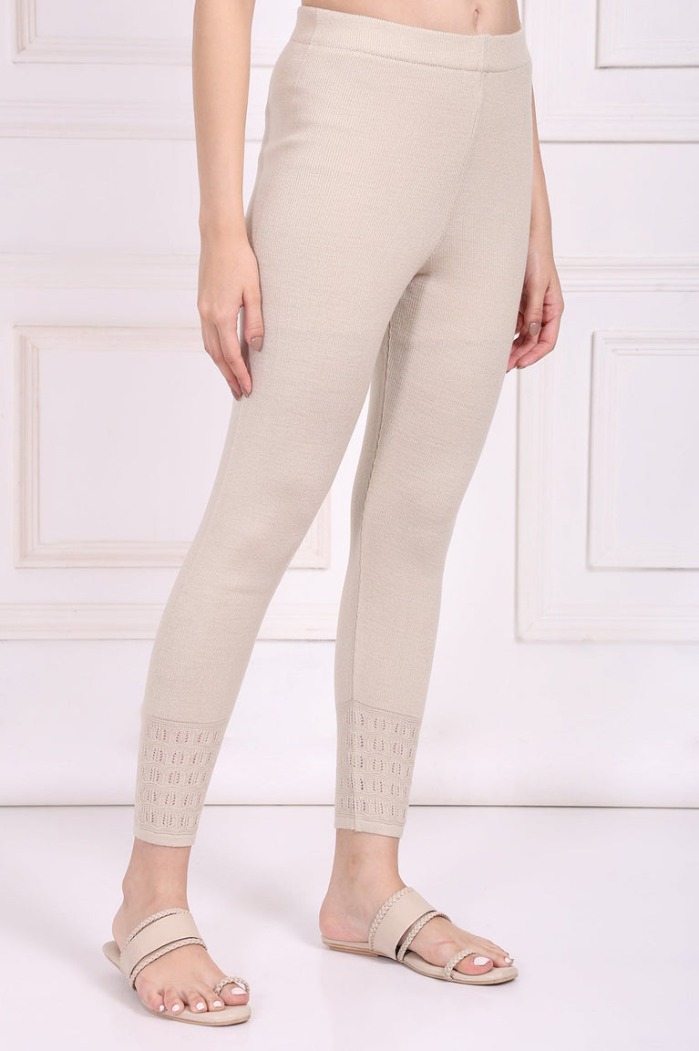 Softly textured elegance! These beige acrylic leggings for women are crafted for winter comfort and style. Featuring a mid-rise elasticated waistband, they offer a snug fit that moves with you. The textured hem design adds a touch of sophistication, making them perfect for pairing with ethnic kurtas or casual tops. Designed for versatility, these full-length leggings are ideal for festive gatherings or relaxed outings. The knit fabric ensures warmth and flexibility, while the solid beige color complements a variety of outfits. A must-have addition to your winter wardrobe, these leggings promise both style and comfort. Word count: 200